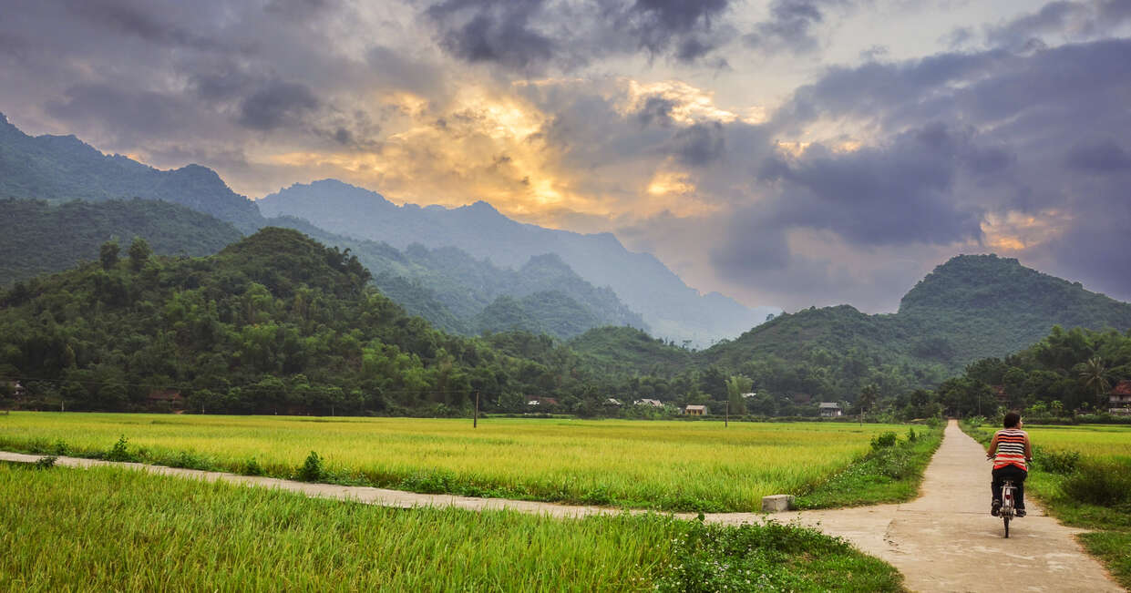 This morning, we head into the countryside to explore the more rural side of Vietnam, and to the source of some of the fantastic ingredients we are sampling. Our day starts with a family learning how to cook the Ninh Binh dish of com chay, literally translated to 'burnt rice'. This crispy rice square is paired with meat, fresh vegetables and secret spices for a thoroughly tasty snack. Afterwards, we'll head outside the village to learn about the farming techniques and practices that have been used here for hundreds of years and passed down through generations. We'll have an opportunity to help cultivate rice, cut banana leaves, tend to the gardens and generally participate in farm life. We eat on the farm, with a meal prepared from the fresh and local produce. After lunch we take an easy bike ride along flat terrain through the lush rice paddies, passing pagodas and through small villages.