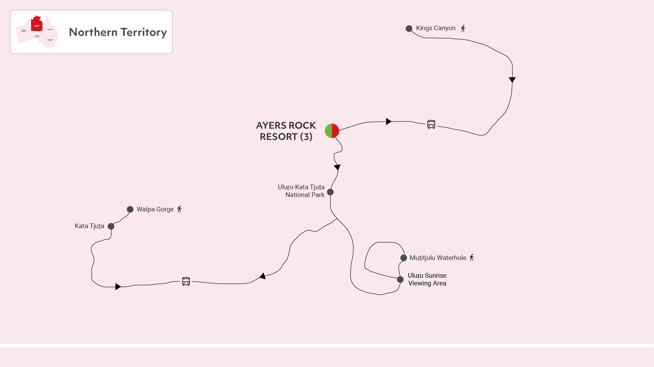 - Uluru-Kata Tjuta National Park Ticket Relax with sparkling wine and nibbles as you watch the sun set over Uluru the Red Centre's iconic landmark. Uluru Barbecue Dinner Embark on a guided hike around the entire base of Uluru, covering approximately 12 kilometers (7.5 miles). Traverse the Kings Canyon Rim Walk to the Garden of Eden Enjoy tea & coffee at the Uluru Sunrise Viewing Area as you watch the sun illuminate the desert landscape Explore Kata Tjuta’s domes and Walpa Gorge Hotel Pick up and Drop Off Experienced Driver Guide Comprehensive commentary Travel in an air-conditioned coach