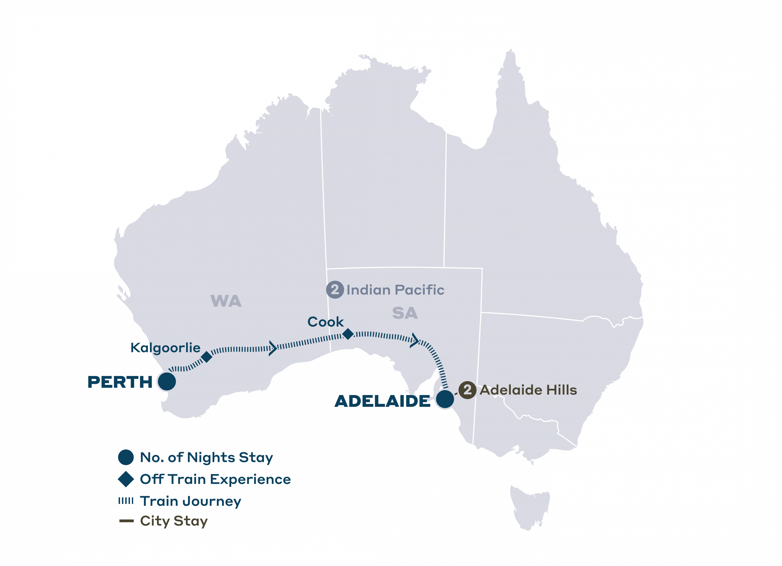 - 2 nights aboard the Indian Pacific, Perth to Adelaide, including all meals, beverages and Off Train Experiences in Kalgoorlie and Cook
