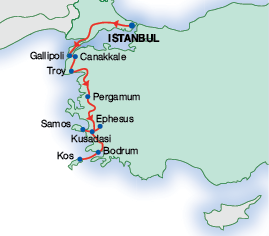 This small group tour, with a maximum of 28 people, starts in Istanbul and ends in Bodrum. It includes 2 nights of accommodation in Istanbul with a sightseeing tour, followed by visits to Gallipoli, Troy, Ephesus, and Kusadasi. Luxury transportation, an English-speaking guide, and entrance fees are included.