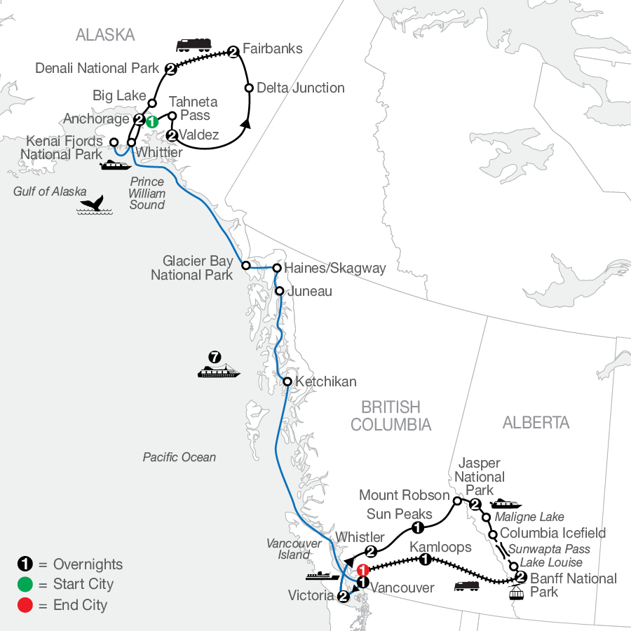 Alaska’s Inside Passage is a protected network of waterways that wind through glacier-cut fjords and lush temperate rain forests along the rugged coast of Southeast Alaska. (B,L,D)TOUR HIGHLIGHTALASKAN ADVENTURE Sailing the Inside Passage offers opportunities to spot some of Alaska’s most iconic wildlife, with humpback whales and orcas plying the bountiful waters alongside the ships, bald eagles soaring overhead and brown bears lumbering on the shoreline. One of the greatest cruising routes in the world, the Inside Passage stretches through stunning landscapes, from Misty Fjords National Monument to famed Glacier Bay National Park & Preserve.