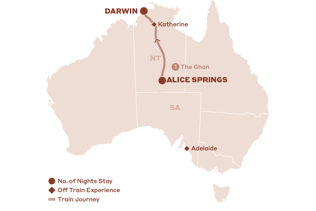 - 2 days / 1 night aboard The Ghan, travelling from Alice Springs to Darwin