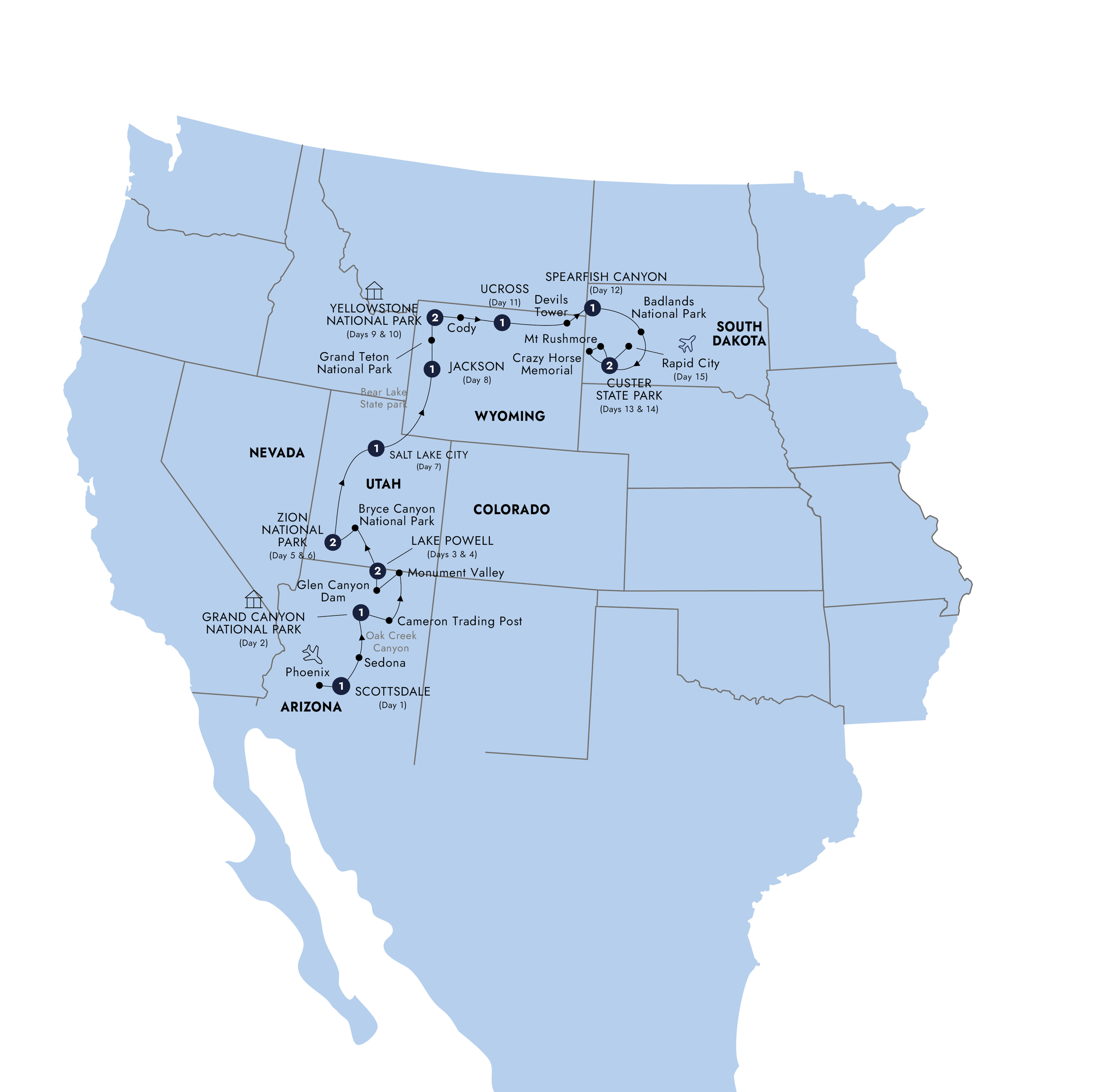 Explore America's top national parks on this 15-Day guided tour. After an evening in Scottsdale, start your journey in bohemian Sedona, where spiritual seekers and nature lovers alike will revel in its red-hued mountainous landscape. Take a short jaunt to the Grand Canyon, where a Local Expert will show you the wonders of America’s most famed natural beauty. In Monument Valley Navajo Tribal Park, Make Travel Matter and board all-terrain vehicles and ride through the desert with your Navajo guide. Glide through Zion National Park on a private shuttle, before watching the red cliffs and valleys give way to the Rocky Mountains of Grand Teton and Yellowstone. Finally, scale the 563-foot-tall Crazy Horse Memorial and stand face-to-face with the stone carving of the Lakota warrior.