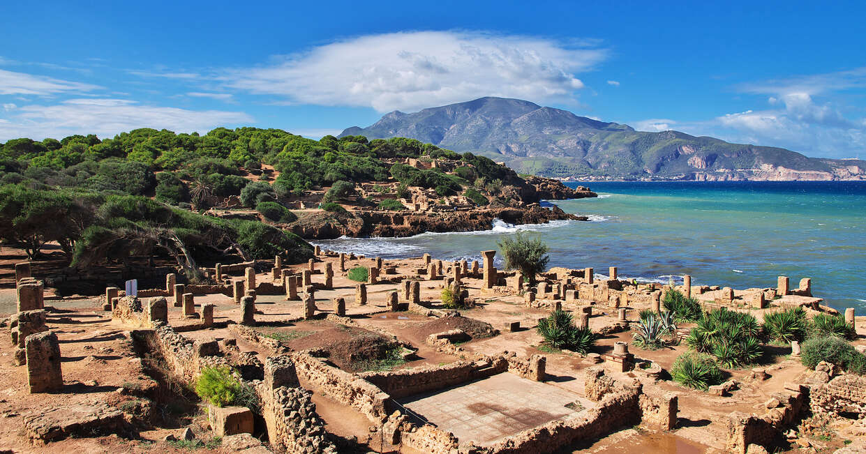 Driving west out of Algiers along the coast, today we'll visit the site of Tipaza, founded by the Carthaginians as a port and trading centre. The site contains a forum, four thermal baths and the outline of a large Christian basilica. The setting is stunning, situated between the mountains and the Mediterranean.