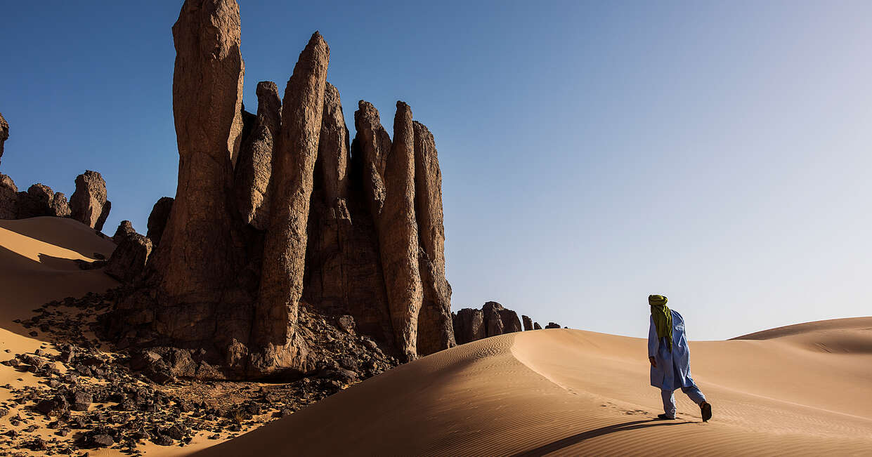 It's a short drive back to Djanet and the Tenere Village Hotel. Once again, day use rooms will be provided to freshen up and have a shower. The rest of the afternoon is free, you may wish to head into Djanet itself or rest at the hotel. This evening, there is the opportunity to join the group for dinner at a local restaurant or at the hotel to celebrate our last night together. We'll drive to Djanet airport, departing around 11pm for our night flight back to Algiers.