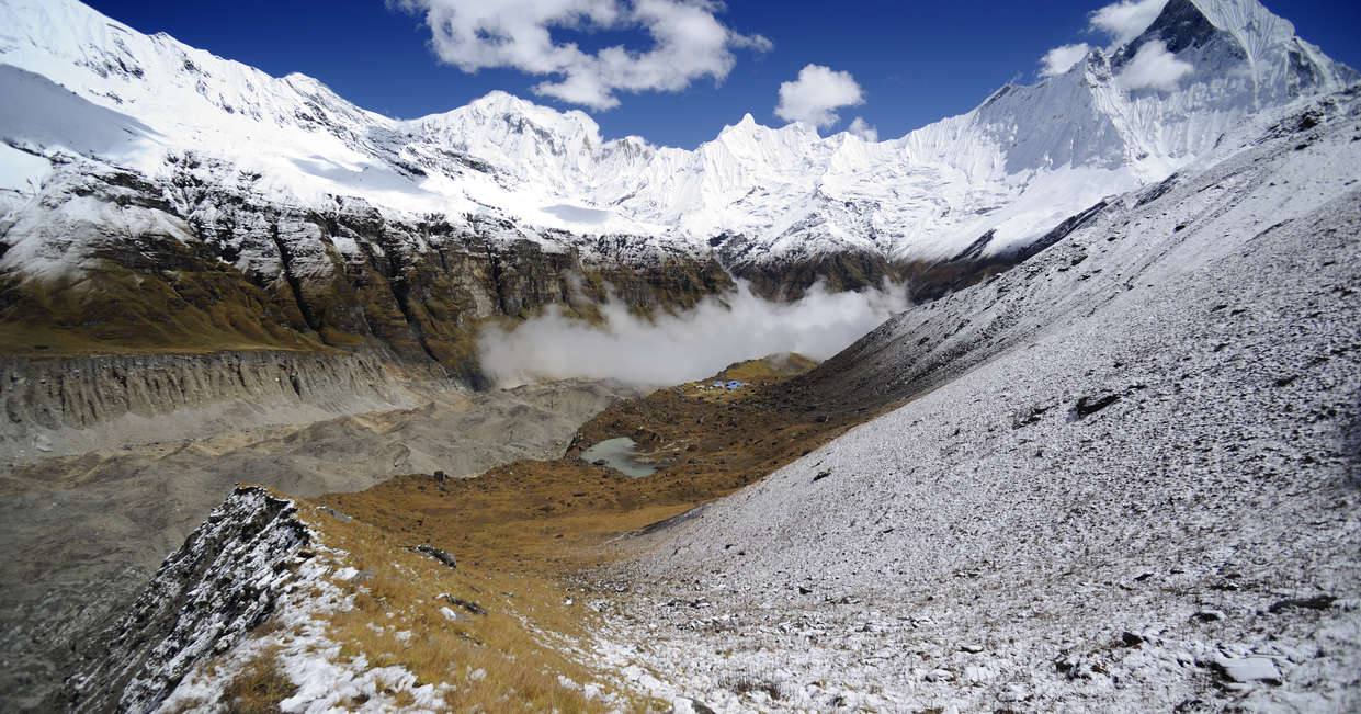 Today we climb further to pass between Machhapuchhre and Huinchuli - the 'Gates' into the Sanctuary. Climbing over the rocky moraine we arrive at Machhapuchhre Base Camp (3,720 metres/12,200 feet). Overshadowed by Annapurna South and the beautiful shape of Machhapuchhre (machha, fish' and puchhre, 'tail'), one of Nepal's holy mountains, this is a quite awe-inspiring setting in which to end our day's trekking, the mountain landscapes providing us with a sight to raise the spirits of even the most tired amongst us.