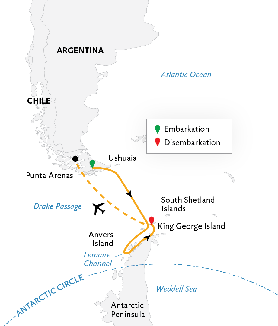 Spot iconic Antarctic wildlife, such as penguins, seals and whalesFly over the Drake Passage and experience the fastest, most direct way to AntarcticaEnjoy presentations on wildlife, history, glaciology & geology by our onboard polar expertsCruise in a Zodiac to get water-level views of icebergs, wildlife and more