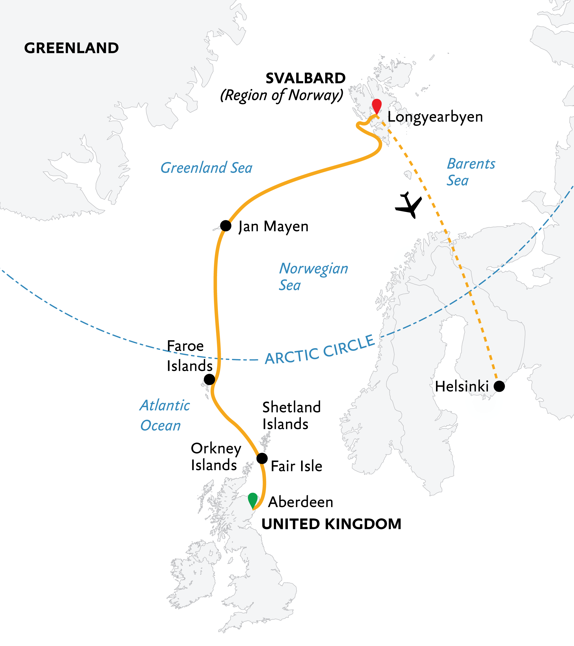 The time has come to say farewell to your newfound friends and Expedition Team. After disembarking, spend the day exploring the frontier-style settlement of Longyearbyen before catching the charter flight to Helsinki.