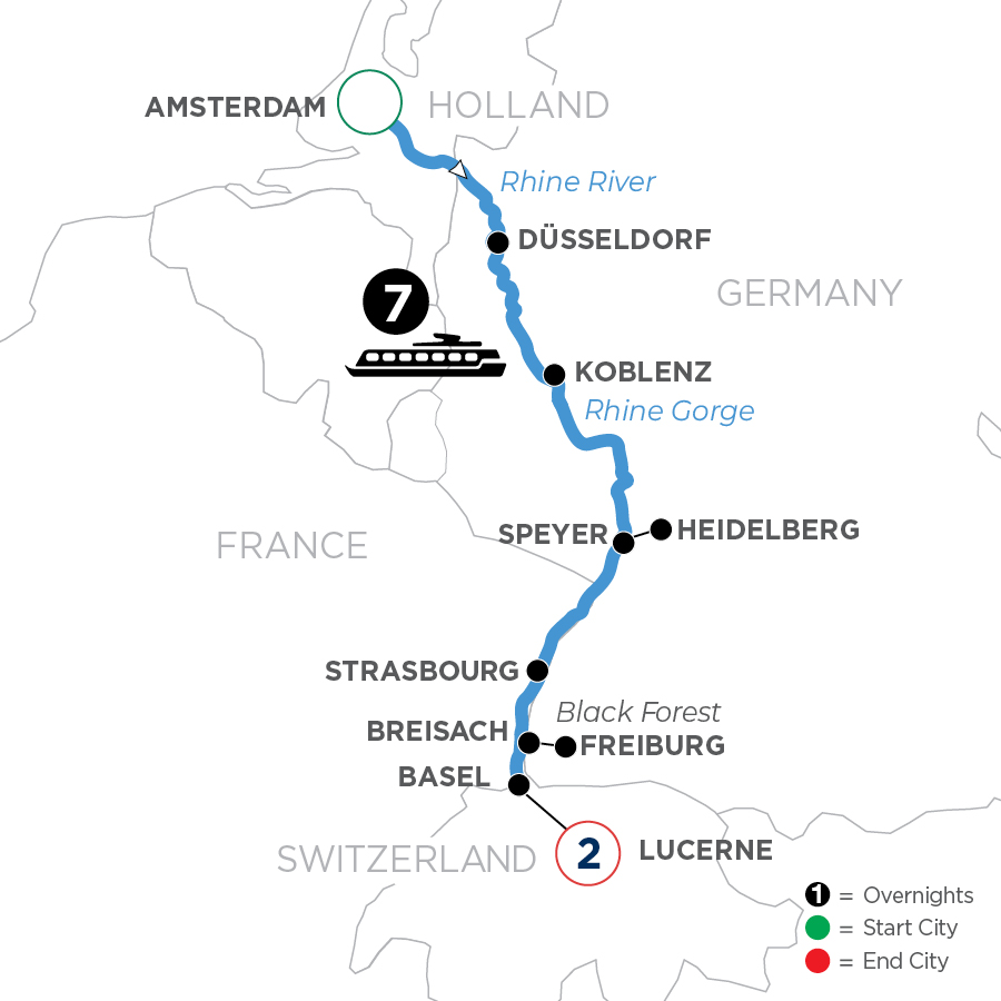 Fairytale settings await on every Rhine River cruise, but an Active & Discovery cruise with Avalon immerses you in new, interactive ways. As you glide from untouched villages to touching cities throughout Holland, Germany and France, our range of excursions, from Classic to Discovery to Active options, presents the opportunity to move at your desired pace and be moved at every turn. Clifftop castles, rolling vineyards, and cobblestone lanes become even more enchanting when you experience them from the seat of a bicycle or an artist’s stool. From culinary walks and beer tours to caves, castles and kayaking explorations, you choose exactly how to toast the joys of the Rhine and your moving journey on it.Move. Enjoy a little get-up-and-go on your cruising vacation when you:•Paddle through the canals of Amsterdam on a kayak.•Take an E-Bike tour surrounded by beautiful vineyards at the confluence of the Rhine and Moselle rivers.•Follow the road less traveled on an exciting hike along Heidelberg’s Philosophers’ Way.And Be Moved.Get off the beaten path and relish the world when you:•Discover your inner street artist with a graffiti workshop in Amsterdam.•Explore the lava caverns on a one-of-a-kind volcano encounter below the town of Mendig.•Join a foodie tour through Strasbourg to discover the cuisine of France’s Alsace region. Plus, Classic sightseeing is always available in every port along the way.Stay longer with a two-night hotel stay in Lucerne! Avalon Choice sightseeing is the perfect highlight of your stay.Activate your senses and discover a world of wonder in all-new, entirely “you” ways on your personal, passion-packed cruise along the Rhine.