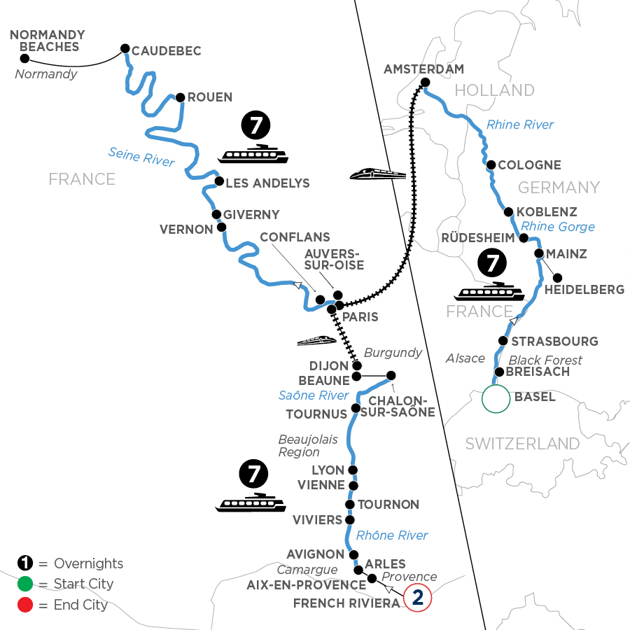 Off to ParisThis morning, board a high-speed train for Paris to embark on your Avalon Suite Ship® and enjoy dinner onboard this evening. EVENING/OVERNIGHT CRUISE TO VERNON(B,D)