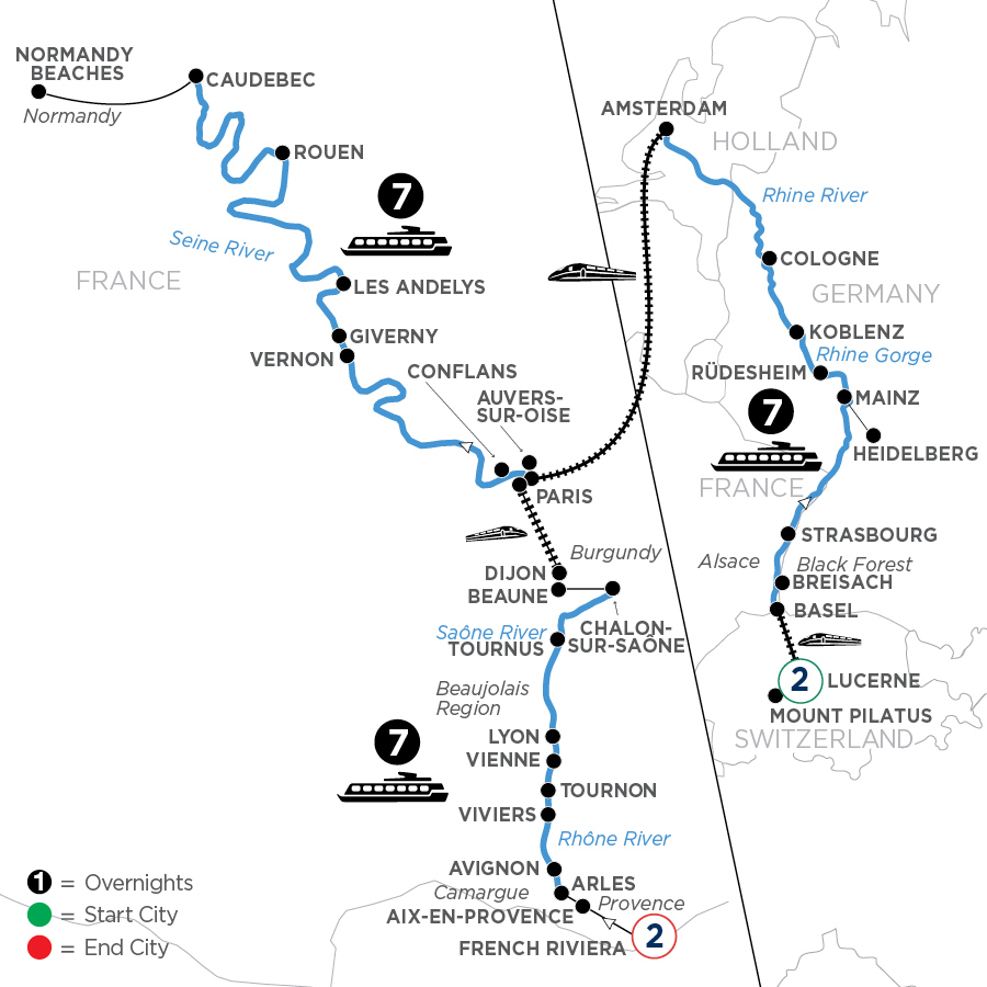 Off to ParisThis morning, board a high-speed train for Paris to embark on your Avalon Suite Ship® and enjoy dinner onboard this evening. EVENING/OVERNIGHT CRUISE TO VERNON(B,D)