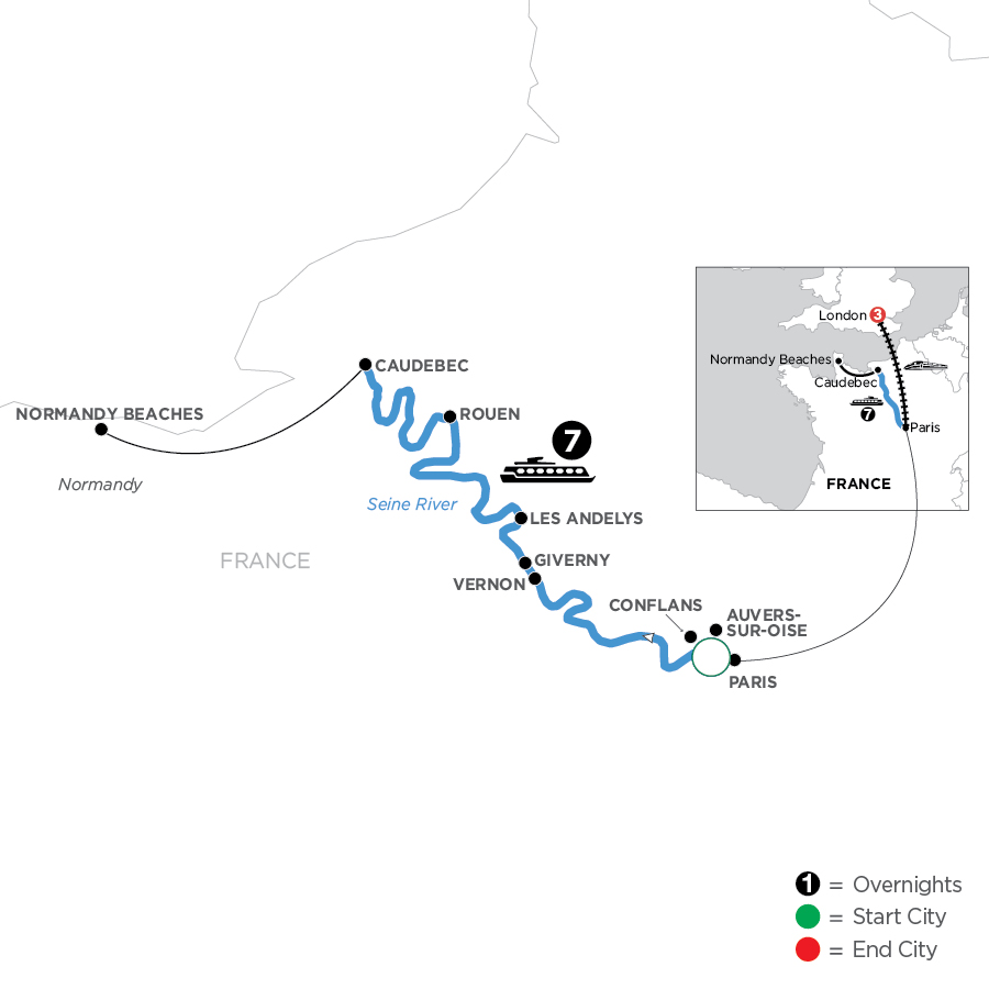 This fabulous Seine River cruise begins and ends in Paris with a 3-night vacation in London to crown your European vacation in style! Take in the beautiful views along the Seine River and the picturesque and historical region of Normandy. In Vernon, choose between two guided visits—Claude Monet’s stunning gardens at Giverny or the remarkable Bizy Castle, known as “Normandy’s Versailles.” From Caudebec, choose from two remarkable excursions—the historic Normandy Landing Beaches, including Omaha Beach, the Pointe du Hoc monument, and the American Cemetery, or experience “A Taste of Normandy.” In Rouen, site of Saint Joan of Arc’s martyrdom, take a guided walk through the medieval quarter and visit the Gothic Rouen Cathedral. From Conflans, go on an excursion to the quaint town of Auvers-Sur-Oise—inspiration for several legendary artists, including Vincent Van Gogh—or visit Napoleon and Josephine’s Malmaison.Return to Paris to discover the true heart of Paris on a guided walk through the sites of Paris’ rich history, or take a tour to see the iconic landmarks of the "City of Light" or take a tour focused on WWII and visit the museum of Les Invalides.Disembark your Avalon Suite Ship® and board a high-speed train to London for three exciting nights. Your package includes superior hotel accommodations, guided sightseeing, and daily breakfasts. Enjoy guided sightseeing with a local expert to see London’s must-see—Parliament, Big Ben, Westminster Abbey, Piccadilly Circus, and more!