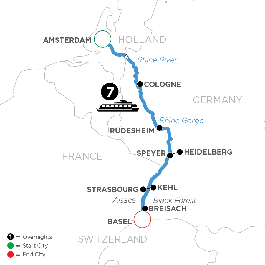 One of Europe’s most legendary rivers takes you across Germany and touches in Holland, France, and Switzerland! A Certified Sommelier will travel with you on your cruise to host lectures, tastings, and tips on food-and-wine pairing. This magnificent Rhine River cruise begins in the ever popular, modern city of Amsterdam, Holland. Cruise on its famous canals along the elegant grachten-the best way to see the treasures of this 700-year-old city dating back to the “Golden Age.” Visit Cologne, Germany—a 2,000-year-old city known for its Gothic-style architecture—and see its famous twin-spired cathedral and Old Town with many shops, cafés, and taverns. Sail through the dramatic Rhine Gorge—offering the most beautiful view of the Rhine River where ancient castles stand on cliffs 400 feet above the water. Cruise to the charming wine town of Rüdesheim and visit the unique Siegfried’s Mechanical Musical Instrument Museum. Continue your Rhine River cruise to Speyer for a guided walk and visit the Wine Museum or take an excursion to Heidelberg to visit the ruins of its red-walled castle. In Strasbourg, France, marvel at the red-sandstone Gothic-style cathedral with ancient murals and fascinating astronomical clock. Also, stroll through the lovely La Petite France district with its quaint shops, delightful bistros, and peaceful waterfront promenade. Stop in Breisach, Germany, and enjoy an excursion to Germany’s Black Forest or take an excursion to the charming village of Colmar, followed by a visit to a chateau wine cellar.About Certified SommeliersSeldom do travelers get the chance to learn about wines from certified experts in the field! Avalon invites you to sail in the company of a certified sommelier who shares elite experience, unsurpassed knowledge, and personal passion for wines on board your ship. We are honored to offer our guests the expertise of certified sommeliers who join select cruises to share their insights and inspiration in all things wine. Truly exclusive experiences for wine lovers!