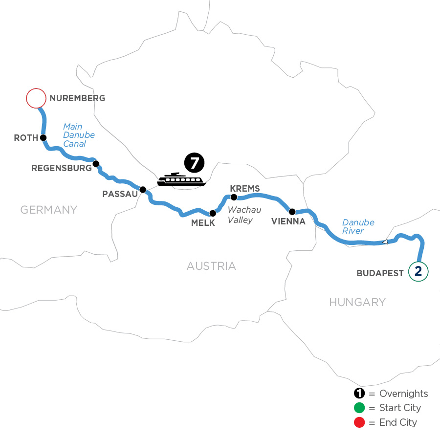 This timeless European vacation begins with two nights in vibrant Budapest, Hungary, before your Danube River cruise with exciting stops in Austria and Germany. In Budapest, Hungary’s lively capital, marvel at the eight bridges spanning the river and enjoy an introduction to the city by a local expert who shows you the must-see sights. Embark on your Avalon Suite Ship® for an amazing view of the landscapes of Bratislava while sailing. Vienna, Austria, offers stunning St. Stephen’s Cathedral, the Habsburg Palace, and the Vienna Opera House. In the heart of the Wachau wine region is Krems, a town seemingly untouched by the modern world. In Melk, visit majestic Benedictine Abbey, one of Europe’s largest monasteries, and enjoy a tasting of some of the Wachau Valley’s famous Austrian wines. Take a guided walk through Passau, with its narrow streets and beautiful Patrician houses. Further up the Danube River, you’ll arrive at the medieval walls of Regensburg—the only German city not bombed during WWII. Your last stop is the thousand-year-old city of Nuremberg, where you’ll marvel at the medieval fortifications, extraordinary Gothic churches, and the Imperial Castle. Your Danube River cruise concludes in Nuremberg.