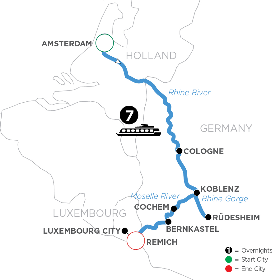 This magnificent European river cruise vacation begins in Holland’s colorful, modern capital of Amsterdam. See the treasures of this 700-year-old city from a unique perspective on a canal cruise along the elegant grachten. Then, embark on your picturesque cruise along the Rhine River to Cologne, Germany—a 2,000-year-old city known for its Gothic-style architecture. On a guided city walk, see the famous twin-spired cathedral, and explore the cobblestone streets of the Old City. You’ll sail through the dramatic Rhine Gorge—the most beautiful stretch of the Rhine River where ancient castles stand on cliffs 400 feet above the water. In the charming wine town of Rüdesheim, enjoy a stroll through its famous cobblestone Drosselgasse lined with shops, restaurants, and lively taverns. Along the Moselle River, stop at the picturesque town of Cochem where the Riesling grape is cultivated. Visit Reichsburg Castle, nestled among vineyards and offering breathtaking views of the town and river valley below. In Bernkastel, enjoy a guided walk and taste some of the region’s best-loved wines. Join an included excursion to historical Luxembourg City, offering unique and dramatic views as it is set on two levels—high above on straddling hills and dropping into two river valleys.