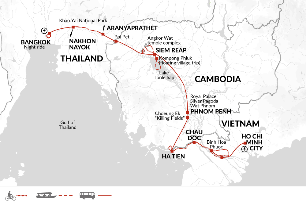 We'll cycle to the impressive Ta Prohm Temple, which is being overtaken by the jungle, and then along hidden trails to explore the ruins at Phimeanakas, the Elephant Terraces, Bayon, Baphoun, and Preah Khan.