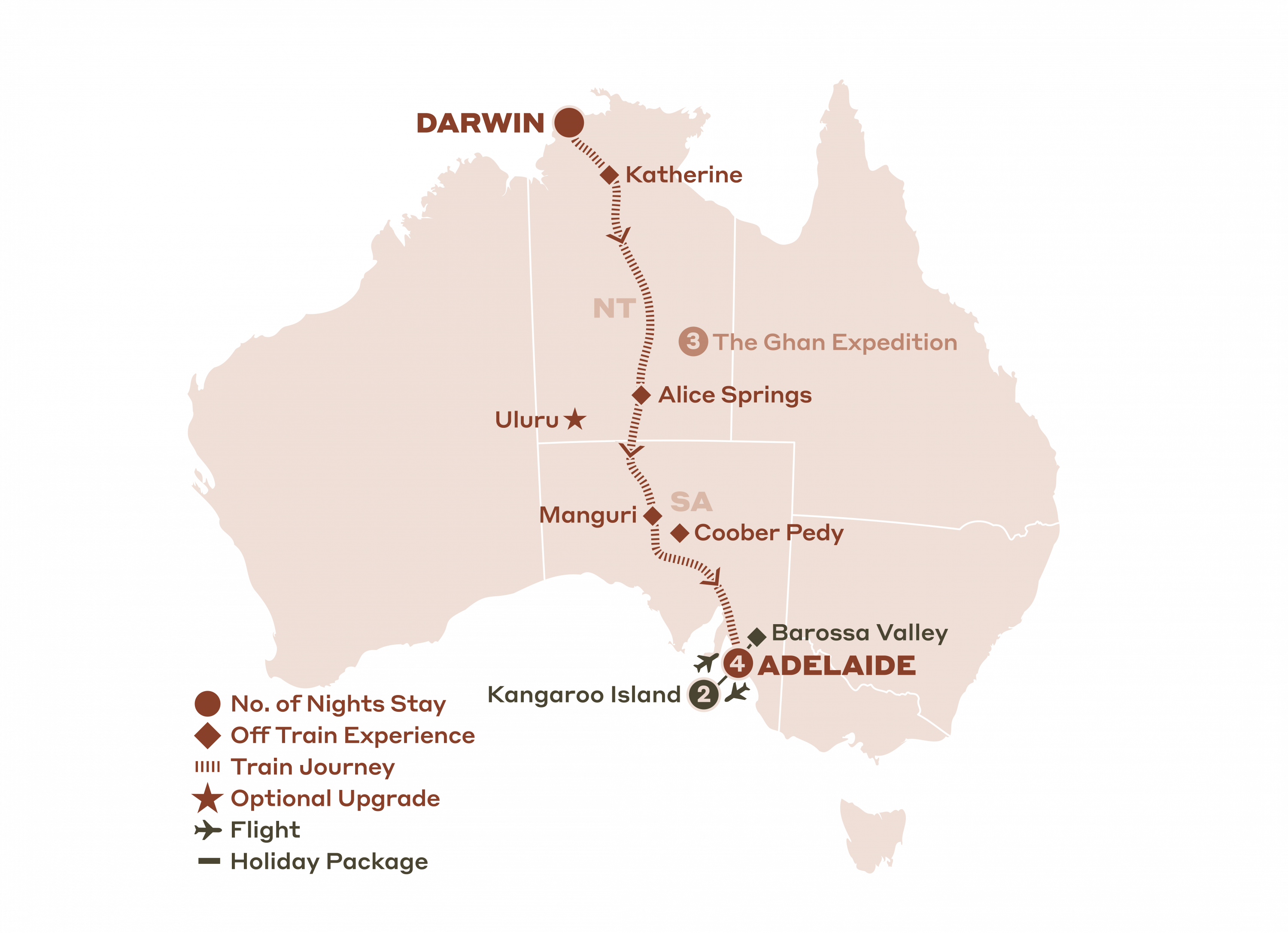 Back on board for your final night, dinner is served in the dining carriage before one last nightcap in the lounge with fellow travellers as The Ghan journeys towards Adelaide. (B,L,D)