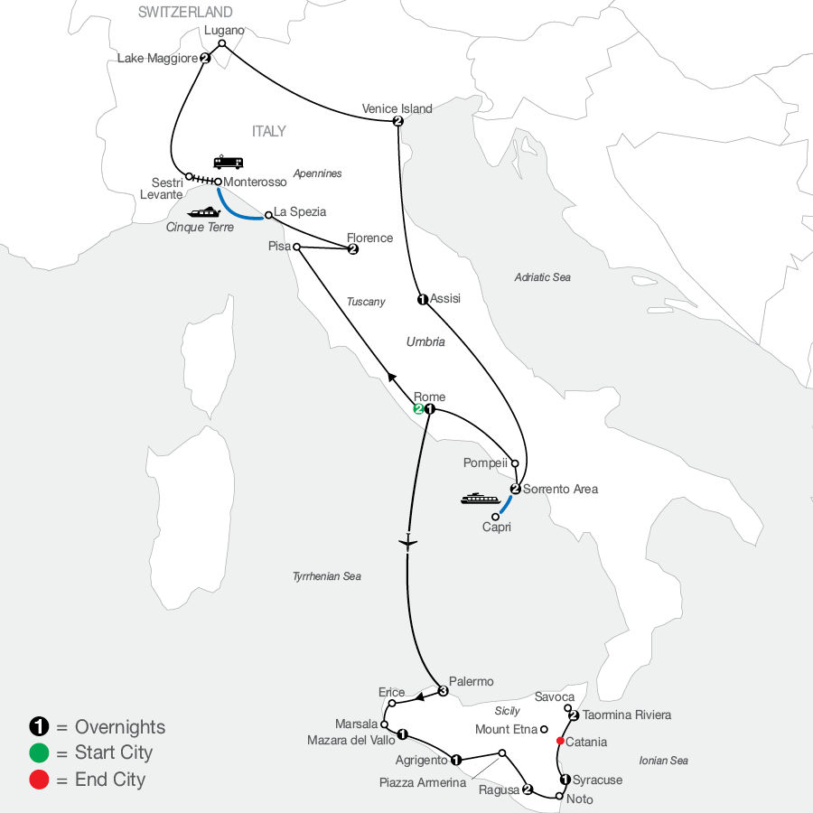 Like the beautiful mosaics gracing the floors and walls of ancient Roman villas, we’ve brought together the most brilliant parts of Italy to create an impact with this visually stunning vacation. Hand selecting experiences from multiple regions of “the boot,” we’ve assembled an imaginative getaway with the brightest pieces of Rome, Florence, and Venice, plus the sultry Italian Riviera, the breezy Lake District, and the sunny coast of Campania. The pastel-tinted Cinque Terre fishing villages, the sparkling blue waters of Capri, and the lemon-tree-lined streets of Sorrento offer a vivid picture of Italy, while the pilgrimage destination of Assisi, the Roman ash preserved city of Pompeii, and the iconic Leaning Tower of Pisa provide just the right accents. Traveling north, south, coastal, and inland, this multi-hued tour of Italy is a picture-perfect montage of memories.Trekked by more than half of humankind’s ancient world, modern day Sicily still offers off-the-beaten-path discoveries that reveal an undiscovered side of Italy. The Phoenicians, Greeks, Romans, Byzantines, Arabs, Normans, French, Germans, Spanish, Italians, and even the British have left an impression on this gorgeous island, and it shows in its diverse architecture, unique culture, and multinational cuisine. As you trace the sparkling coast from the flamboyant capital city of Palermo to the ultra-chic Taormina Riviera, you can expect stunning archaeological treasures, ancient works of art, and a warm welcome at every turn, and a cool gelato on every corner. Traditional granita, cannoli, and Marsala wine serve to sweeten the experience on this Undiscovered Tour of Italy&Sicily. PLUS, your tour includes your choice of excursions in Rome, Venice and Ragusa so you can plan your day your way.