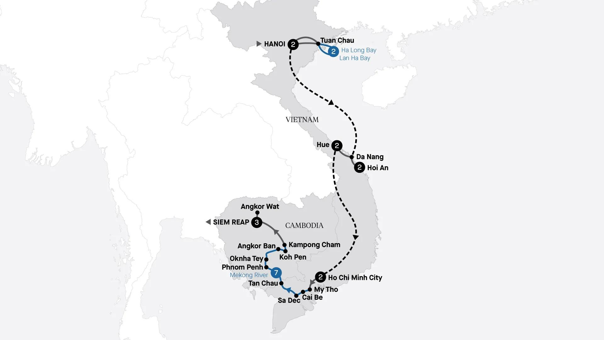 Explore Vietnam and Cambodia from Hanoi to Siem Reap, home to majestic Angkor Wat. Spend three days cruising Ha Long Bay and discover Hoi An, Hue and Ho Chi Minh City before seven nights aboard the Mekong Serenity, cruising to Siem Reap. See Phnom Penh and charming riverside villages along the way.