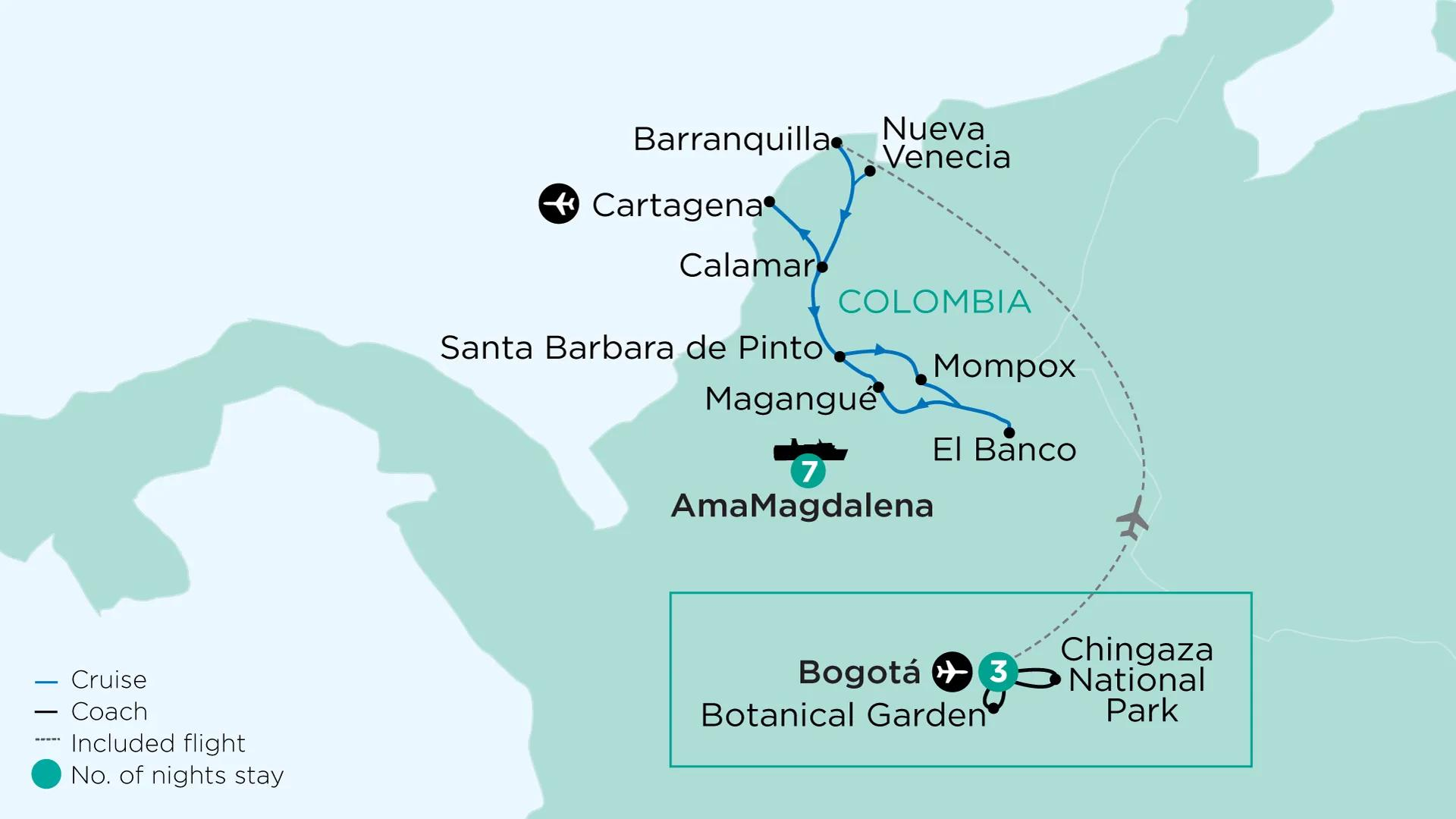 Cruise Colombia’s enchanting and largely unexplored Magdalena River during seven nights aboard the boutique river ship, AmaMagdalena. Visit riverside villages learning about their culture and local crafts. Discover the diverse flora and fauna of Chingaza National Park, including the distinctive high-altitude shrub, frailejones. Learn more about Colombia’s native plants during a visit to Bogotá Botanical Garden. And see the vivid and vibrant buildings of Cartagena and Mompox.