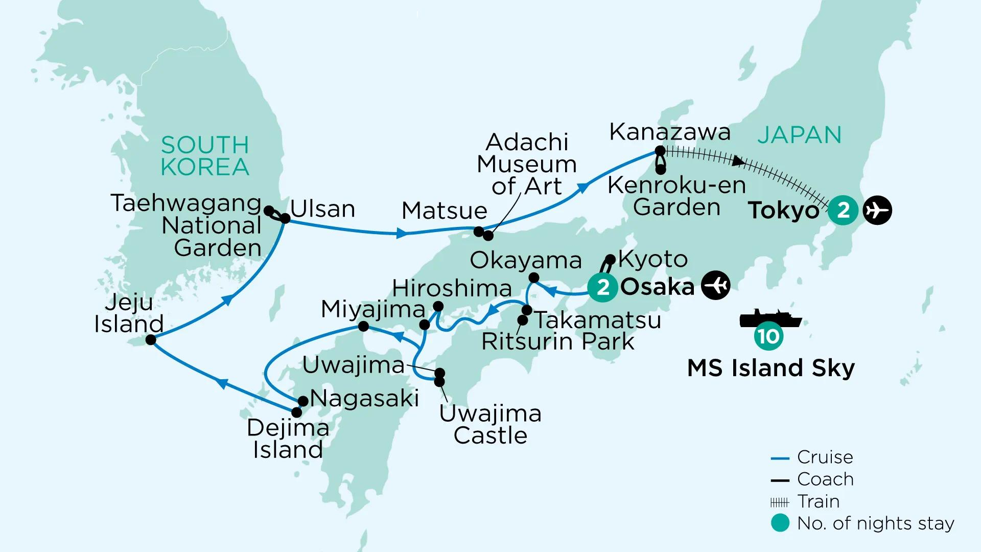 Take hold of this once-in-a-lifetime opportunity to cruise the islands of Japan. Embark the MS Island Sky, enjoying a 10-night privately chartered voyage, stopping in at celebrated cities, as well as remote, lesser-known regions. Travel during cherry blossom season, a time of year revered by Japanese people. Embrace regional art and culture, in the Geisha District of Kanazawa, at Adachi Museum of Art near Matsue, and during a special tea experience in the city of Uwajima. Admire the world-renowned Kenroku-en and Koraku-en gardens. And explore the South Korean city of Ulsan and Jeju Island.