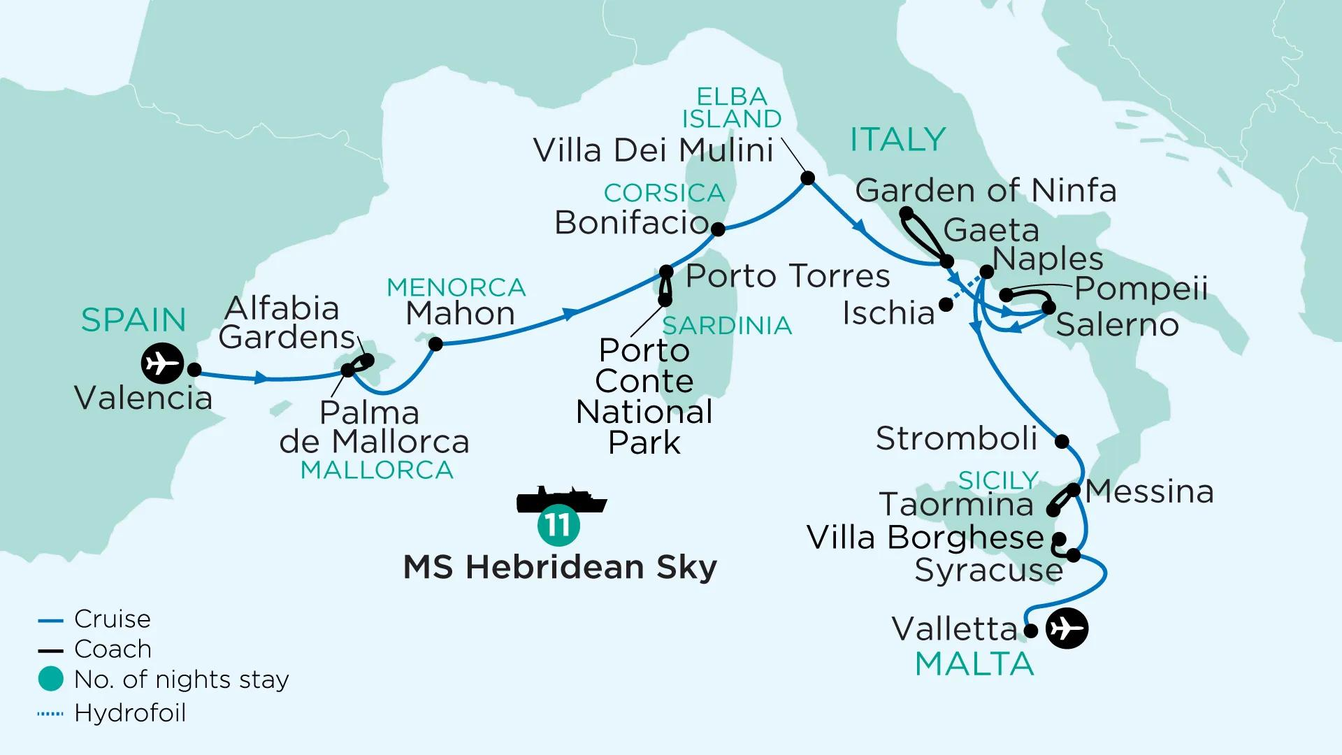 Access smaller ports and islands during our 11-night, exclusively chartered cruise. Our nimble vessel, MS Hebridean Sky, sails from Valencia, in Spain, to Malta’s historic port of Valletta.