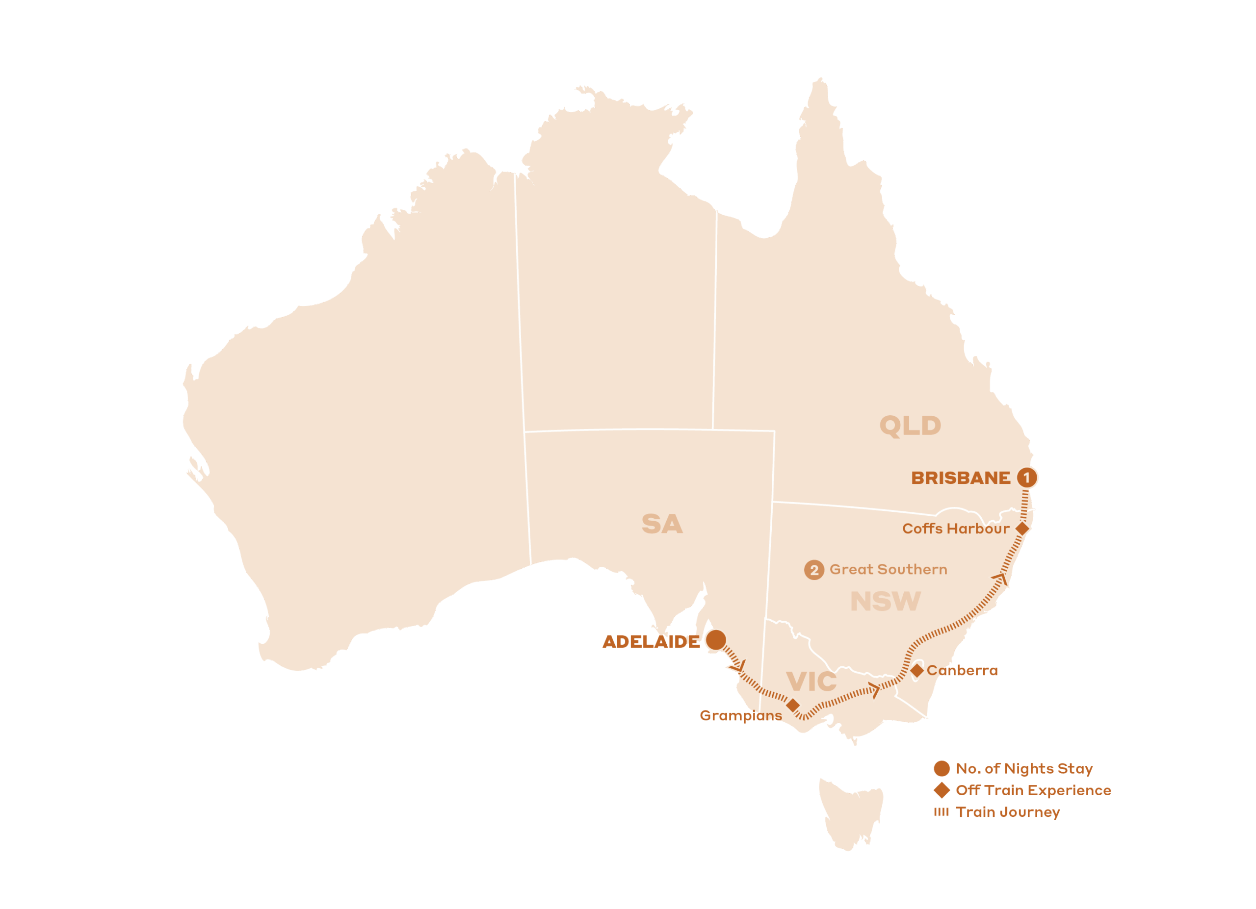 - 2 nights aboard the Great Southern, Adelaide to Brisbane, including all meals, beverages and Off Train Experiences in the Grampians, Canberra and Coffs Harbour