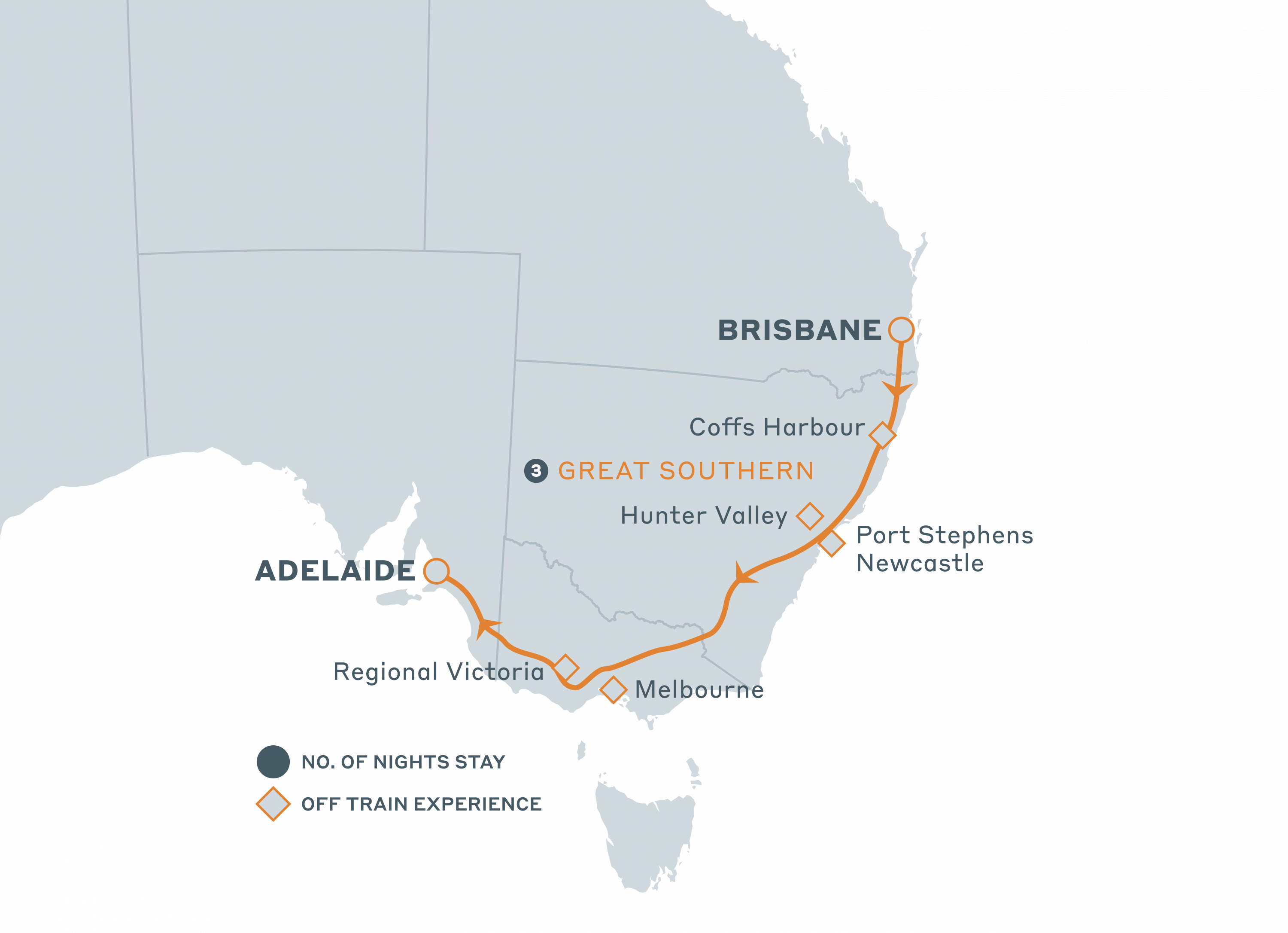 - 3 nights aboard the Great Southern, travelling from Brisbane to Adelaide