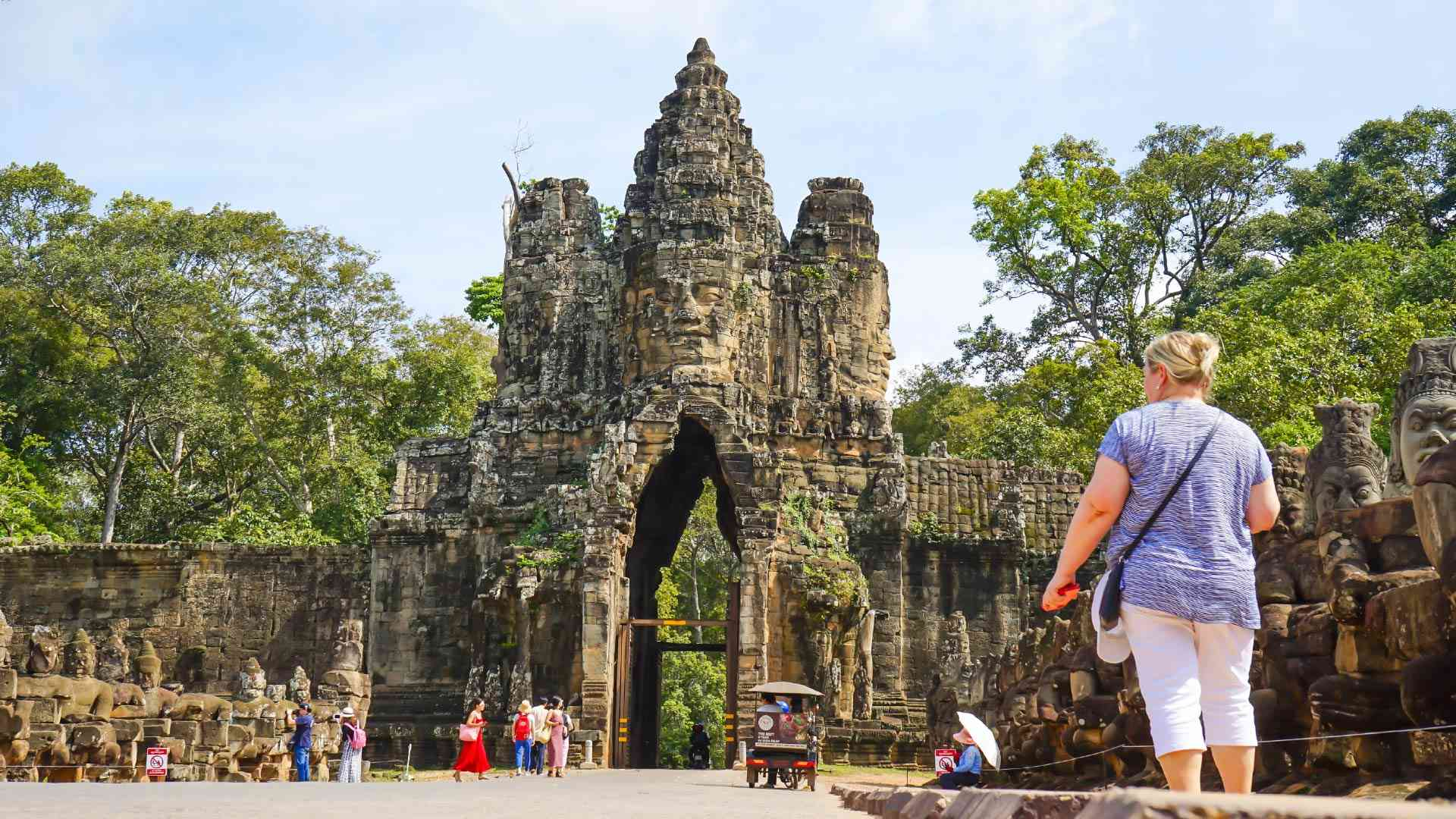 Our introduction to Siem Reap’s sights begins with a visit to the fortified city of Angkor Thom. This dramatic structure covers an area of 10 square kilometres. Enclosed by a wall and wide moats, it includes many of Angkor's most popular sights. We enter by the monumental south gate over a causeway lined on either side by statues of demons and gods, each carrying a giant naga (snake-like creature).