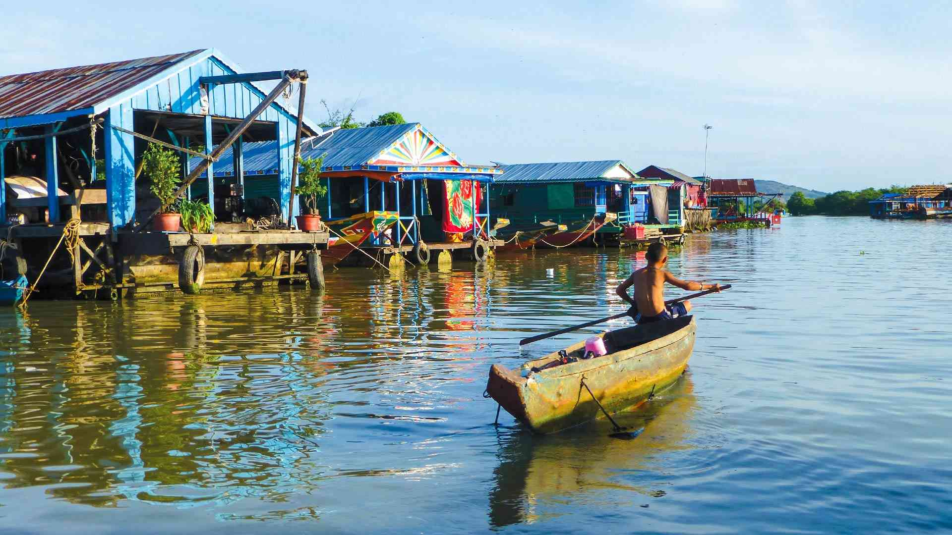 In the afternoon we make our way to Tonlé Sap Lake, the largest freshwater lake in Southeast Asia. During the monsoon season the lake swells to four times its normal size, so it’s important for the locals that live on the banks and surrounds to build their houses on stilts. Here we’ll board a boat and take a ride along the canal of the lake, giving us an opportunity to see how the locals live in their colourful stilt houses. Watch children playing on the banks while fishermen wade in the shallows with nets and traps. As we reach the mouth of the canal and lake the stilt houses end, and boats are transformed into houses to make up the floating villages.