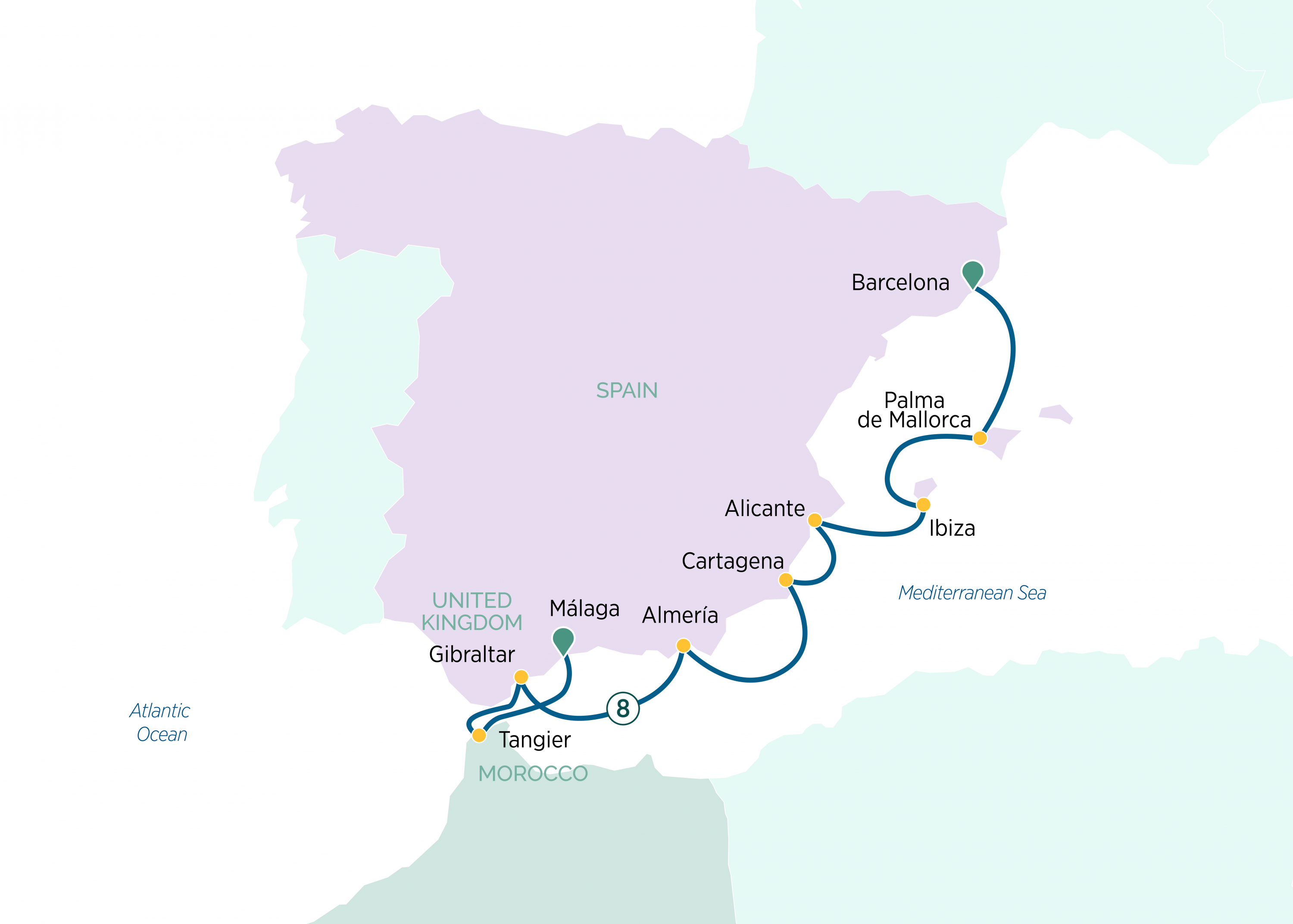 This memorable nine-day cruise from Barcelona to Málaga explores Spain’s wildly beautiful coastline, from Catalonia to Andalusia. Setting sail from the vibrant city of Barcelona, you'll stop at fascinating coastal cities in the Western Mediterranean like Castellón de la Plana, Alicante and Cartagena, famous for its ancient Roman ruins. Marvel at the Cathedral of Santa Maria in Spain’s Palma de Mallorca, admire unique and diverse landscapes from the desert to the sea in Almeria, or join the throng of locals at a bustling market fragrant with spices in Tangier. Your voyage concludes in Malaga, on Spain’s southern shores, renowned for its excellent beaches, expressive culture and gourmet cuisine.