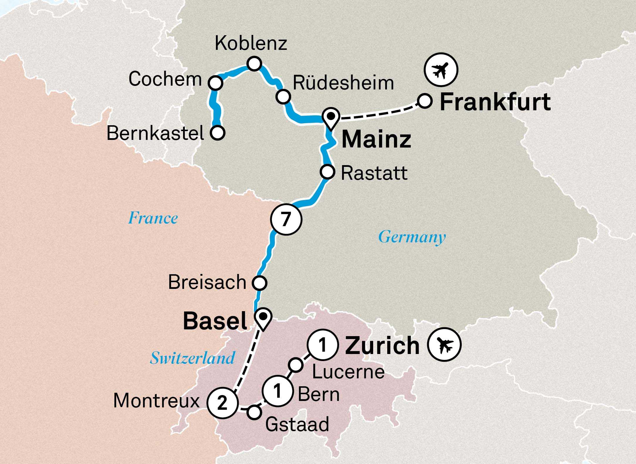 Explore magical Switzerland before a 5-star ultra-luxury cruise along the glorious Rhine and Moselle rivers, past lush vineyards, ancient castles and postcard-perfect villages. Discover the charm and beauty of small towns like Rüdesheim and Limburg, marvel at ancient castles and admire grand palaces.