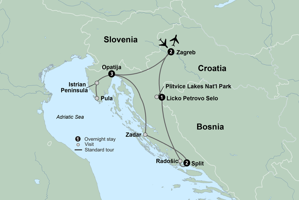 Travel back in time – and explore the fascinating present – as you tour through stunning Croatia. Discover the Pula Arena, a wonderfully preserved Roman amphitheater, as well as the massive Diocletian’s Palace, built as an emperor’s retirement villa. Take a walk along the cascading lakes of Plitvice Lakes National Park and enjoy a three-night stay at Opatija, a celebrated seaside town known for its mild climate. Wander through a Dalmatian village and learn about its heritage and traditions, and experience light and sound in a whole new way at Zadar’s popular art installations. Throughout your tour, get a taste of regional cuisine with beautifully prepared meals featuring fresh local ingredients.