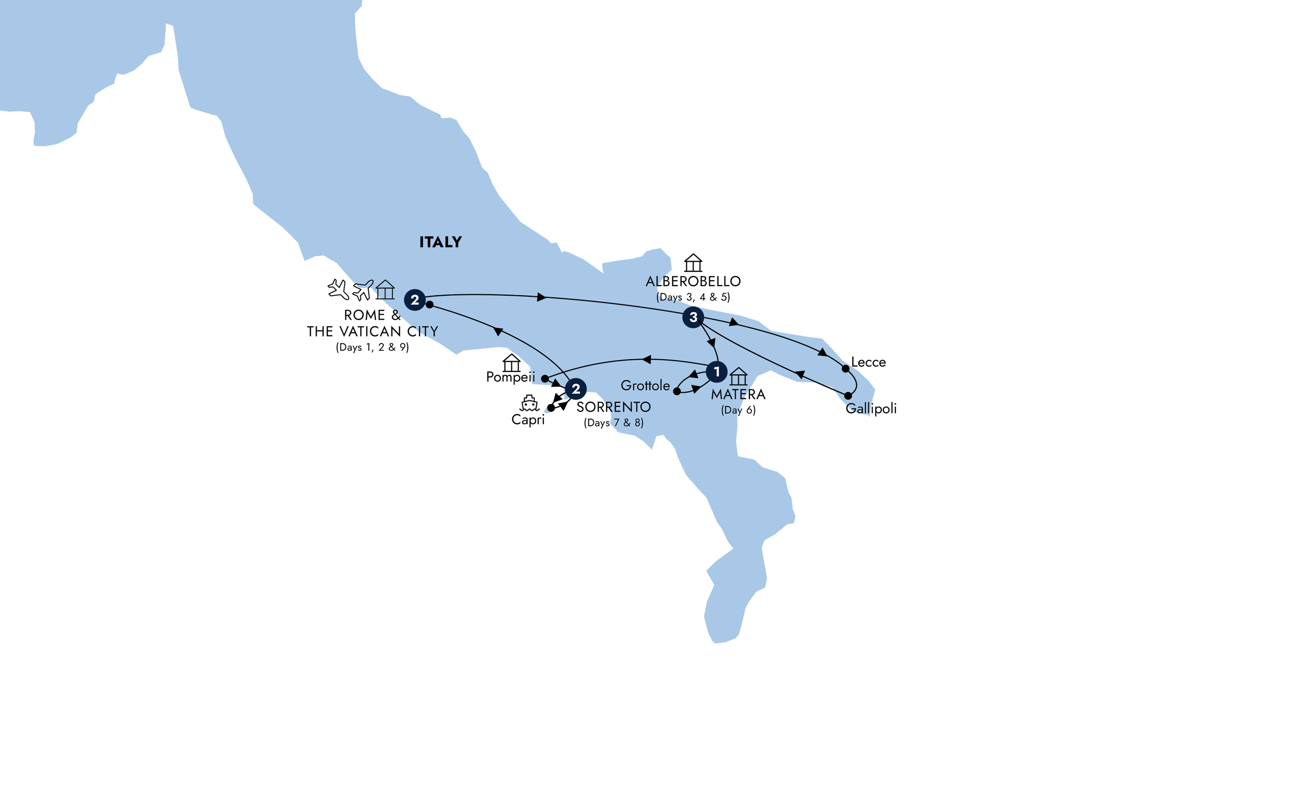 Indulge in Italy’s finest food and views during this 9-day guided tour. In Rome, discover the city on a walking tour with a Local Expert and see the Vatican City. In Sorrento, settle into a luxurious resort and take in the views of Mount Vesuvius, which buried Pompeii in a sea of lava in 79 A.D. Indulge your curiosity from an insightful MAKE TRAVEL MATTER® Experience in the village of Grottole to viewing the Trulli of Alberobello UNESCO World Heritage Site.
