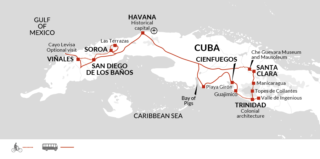 The ride concludes near the town of La Nuevas, followed by a coach transfer to Havana (approximately 3 hours/250 kilometres).