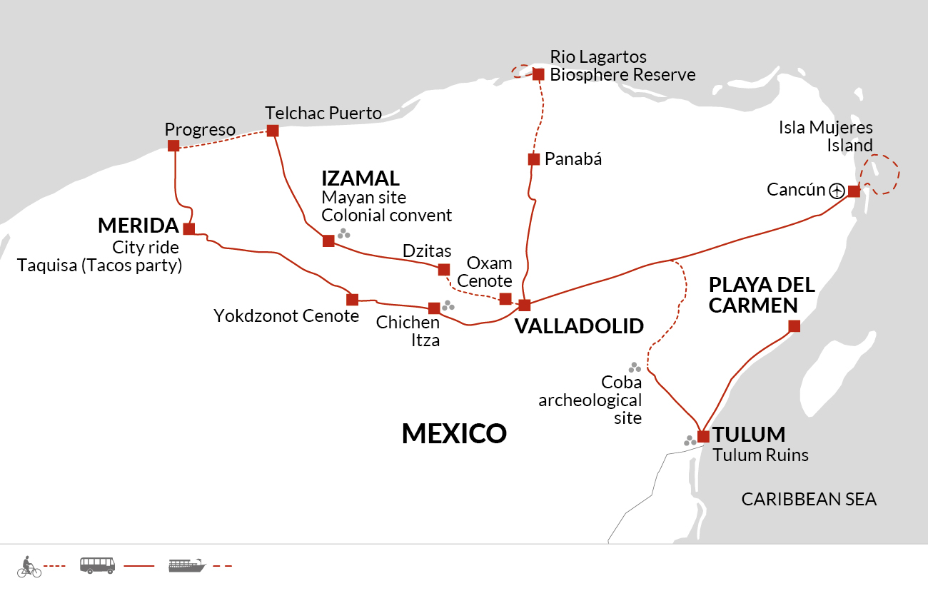 This morning, we'll have time to familiarise ourselves with our bikes and make any necessary adjustments. Once everybody is comfortable, we'll pedal off. The first 3.5 kilometres/2.1 miles of our route are on paved roads as we head east to Puerto Juarez. There, we'll catch a ferry for the short journey across to Isla Mujeres (30 minutes).