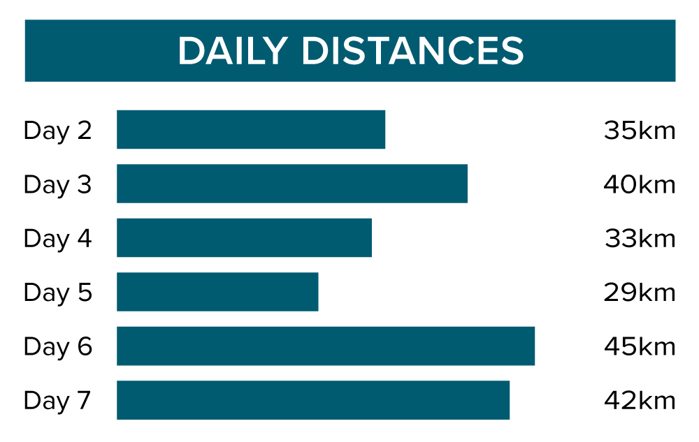 Our total cycling distance today is around 40 kilometres/25 miles with a total accumulated ascent of 350 metres/1,150 feet.