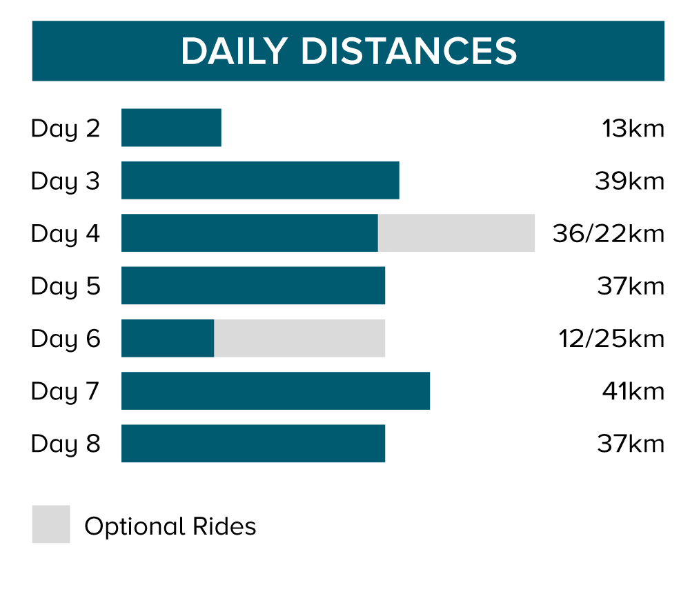 Our total cycling distance today is approximately 36 kilometres/22.3 miles, with an optional 22 kilometre/13.6 mile ride back to the hotel.