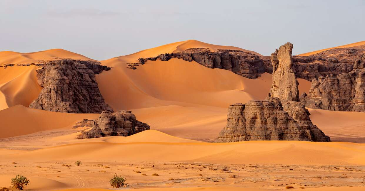 This afternoon, we head into the desert once more for our final night. Driving one hour north of Djanet this time, we'll explore Timrass, a dramatic area of rocks protruding from the desert sand. Here we'll discover more rock art. We'll then continue to the landscapes of Tekoubaouine where we camp in a great spot for sunset amongst the dunes, hills and rock formations, our last night in the desert. Our cook will have stocked up on fresh supplies in Djanet and will prepare a delicious last camping dinner for us.