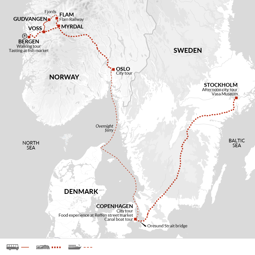 A local bus takes us to Gudvangen to take a cruise along the Naerofjord and Aurlandsford to Flam. The memorable journey passes towering cliffs and cascading waterfalls as it makes its way to Flam. Here we board the train at Voss to Myrdal, where we board the famous Flam railway. This spectacular train ride offers panoramic views of Norway's rugged landscape including a stop at the majestic Kjossen waterfall.