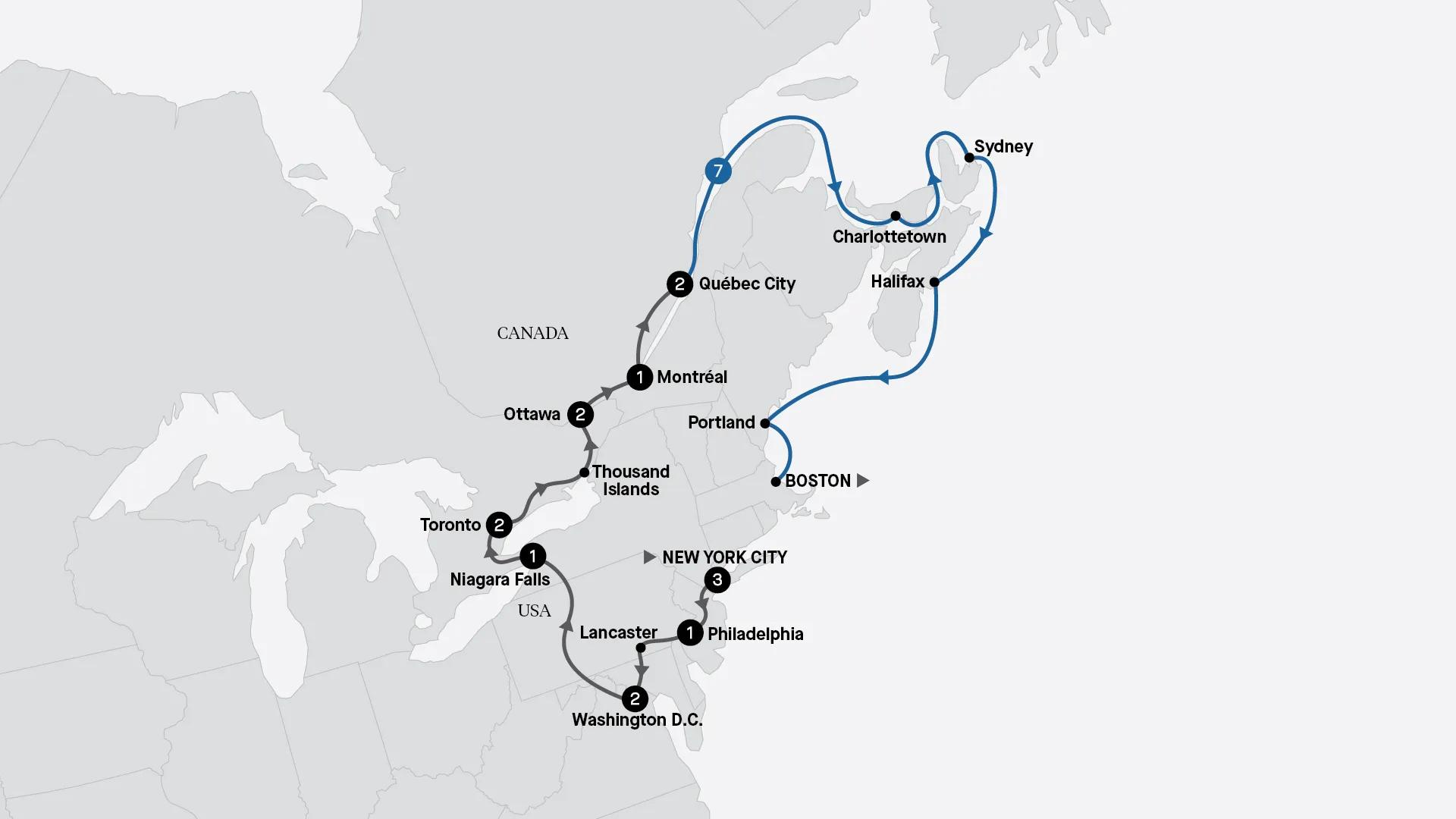 Kick off your adventure in the vibrant cities of the USA before journeying to Eastern Canada and setting sail through the scenic shores of New England. From the energy of New York City to the charm of Montréal and the coastal beauty of Halifax, discover North America's most remarkable destinations.