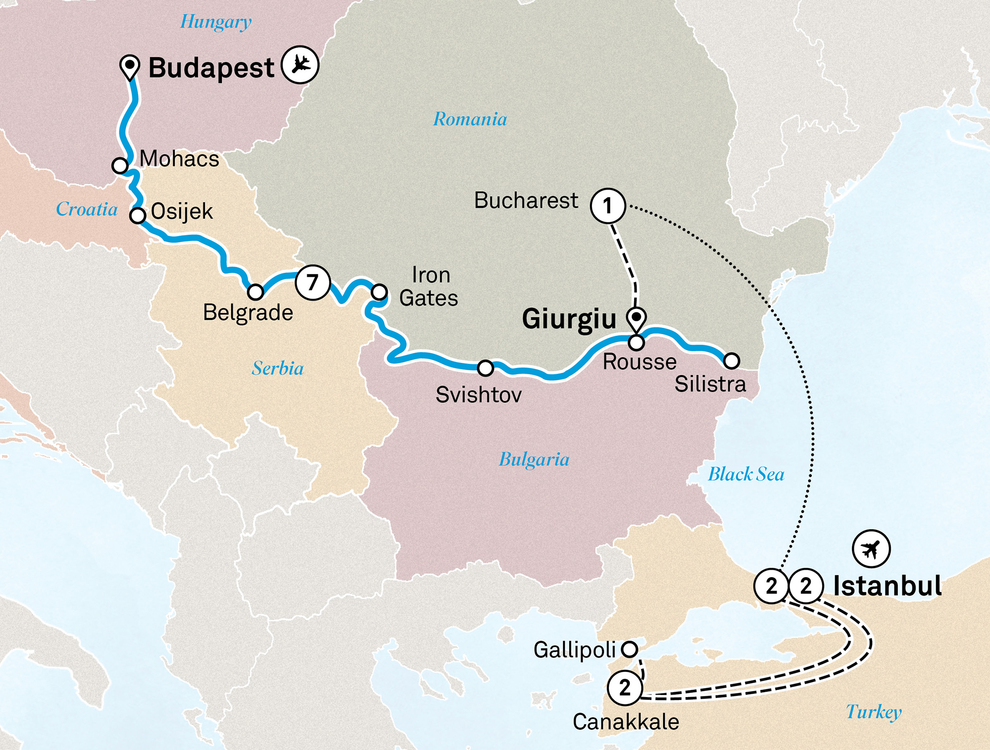 Take a fascinating cruise along the Danube, from Budapest all the way to Romania. You will see the hidden gems of Eastern Europe, from the eclectic Serbian city of Belgrade to the well-preserved Baroque town of Osijek in Croatia, cruising through narrow gorges and soaring cliffs of the Danube’s Iron Gate. This varied itinerary will also give you ample time to relax on board in luxurious surrounds as you watch Danube River life rolling by. Disembark and after a night in Bucharest board your included flight to Istanbul, a fascinating city that straddles two continents, for a seven-day land extension. Walk the bustling streets of Istanbul and the intoxicating Grand Bazaar, visit the WWI battlefield of Gallipoli, and discover the vibrant city of Çanakkale.
