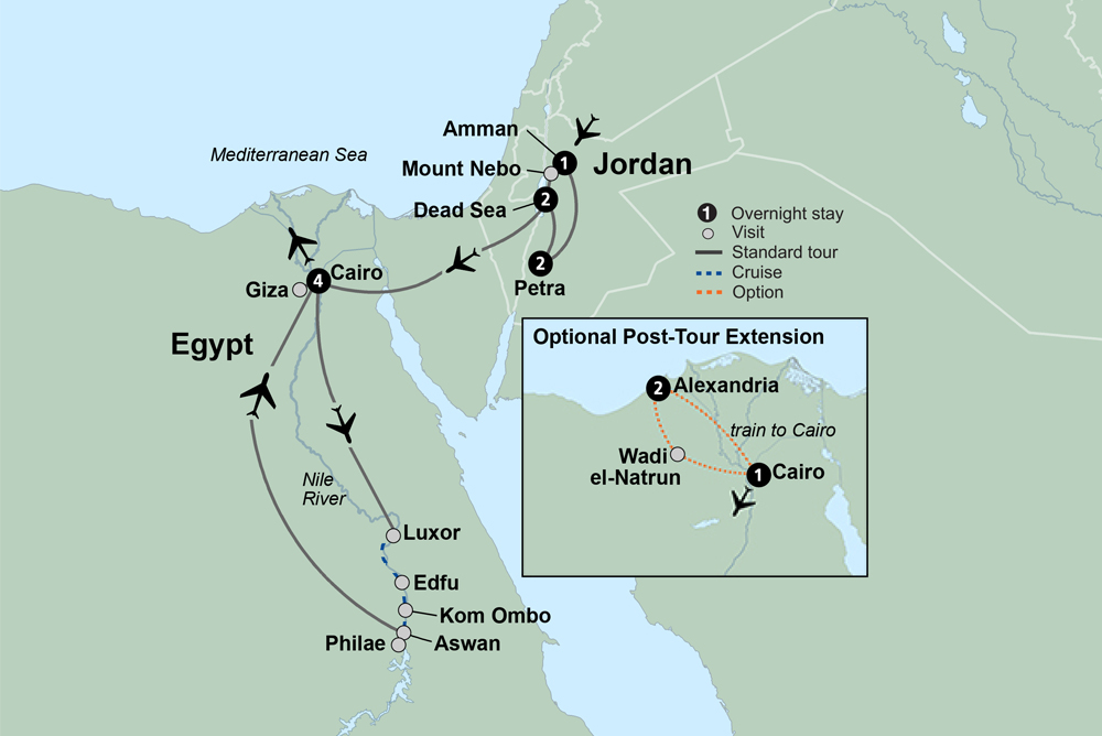 Experience a dramatic world beyond imagination as you enter into lands of legends, relics, and indescribable beauty. Take in Petra, the “Rose Red City” that appears as if it emerged straight from the rock bed. Participate in an Arabic cooking class, where you’ll use fresh ingredients from local markets to create delectable flavors. Relax at a deluxe spa resort on the northern shore of the Dead Sea. Visit the famous Pyramids of Giza and the stoic Sphinx. Unwind on a four-night cruise on the Nile, the world’s longest river. Eons of history and iconic wonders, mouthwatering bites of savory cuisine, and stretching sunsets fading against the desert horizon – this is the essence of Jordan and Egypt.