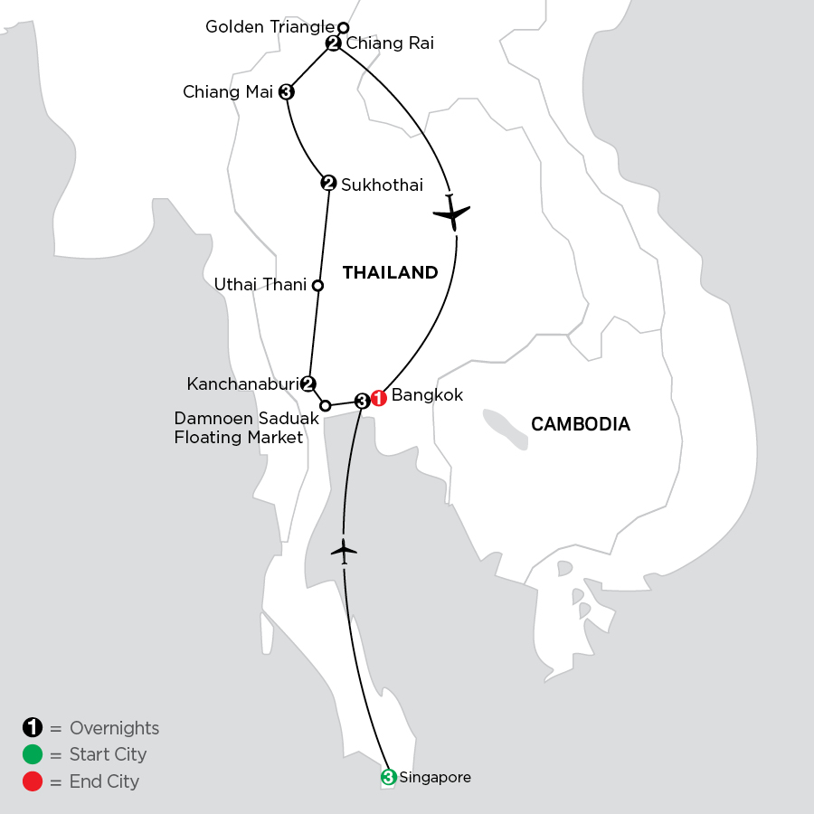 Discover a rich history, fascinating cultures, religious monuments, and much more on this fantastic tour of Thailand and Singapore. Start your journey in Singapore, one of the world’s great melting pots. Your guide will show you all the highlights, taking you to visit the Gardens by the Bay and Marina Bay, where you ascend to the Skypark Observation Deck to admire beautiful views of the city and its surroundings. In Bangkok—Thailand’s current capital—visit the Temple of the Golden Buddha; the Temple of the Reclining Buddha built in 1832; and the Grand Palace, the royal residence established in 1782 where you’ll see the Emerald Buddha, Thailand’s most sacred Buddhist sculpture. You’ll also cruise the city’s canals (klongs) by long tail boat. Travel to one of Thailand’s most beautiful provinces – Kanchanaburi. Take a long tail boat ride through vibrant Damnoen Saduak Floating market. Ride a train over the famous River Kwai Bridge, part of the infamous Death Railway built by prisoners during World War II. Visit Hellfire Pass Memorial, a walking trail and interpretive center detailing the life of the Allied prisoners and Asian workers who helped build the railway. In Sukhothai, Thailand’s 13th-century capital, visit Sukhothai Historic Park, a UNESCO World Heritage Site with ruins of palaces, temples, and homes. But that’s not all…in Chiang Mai explore a night market by tuk-tuk and visit an amazing elephant sanctuary to learn about the conservation efforts of orphaned and rescued elephants. Travel to the “Golden Triangle,” where Thailand, Laos, and Myanmar meet, and visit a local tea plantation. Your vacation in Thailand and Singapore is rich in experiences, sights, and welcoming people you’ll long remember!