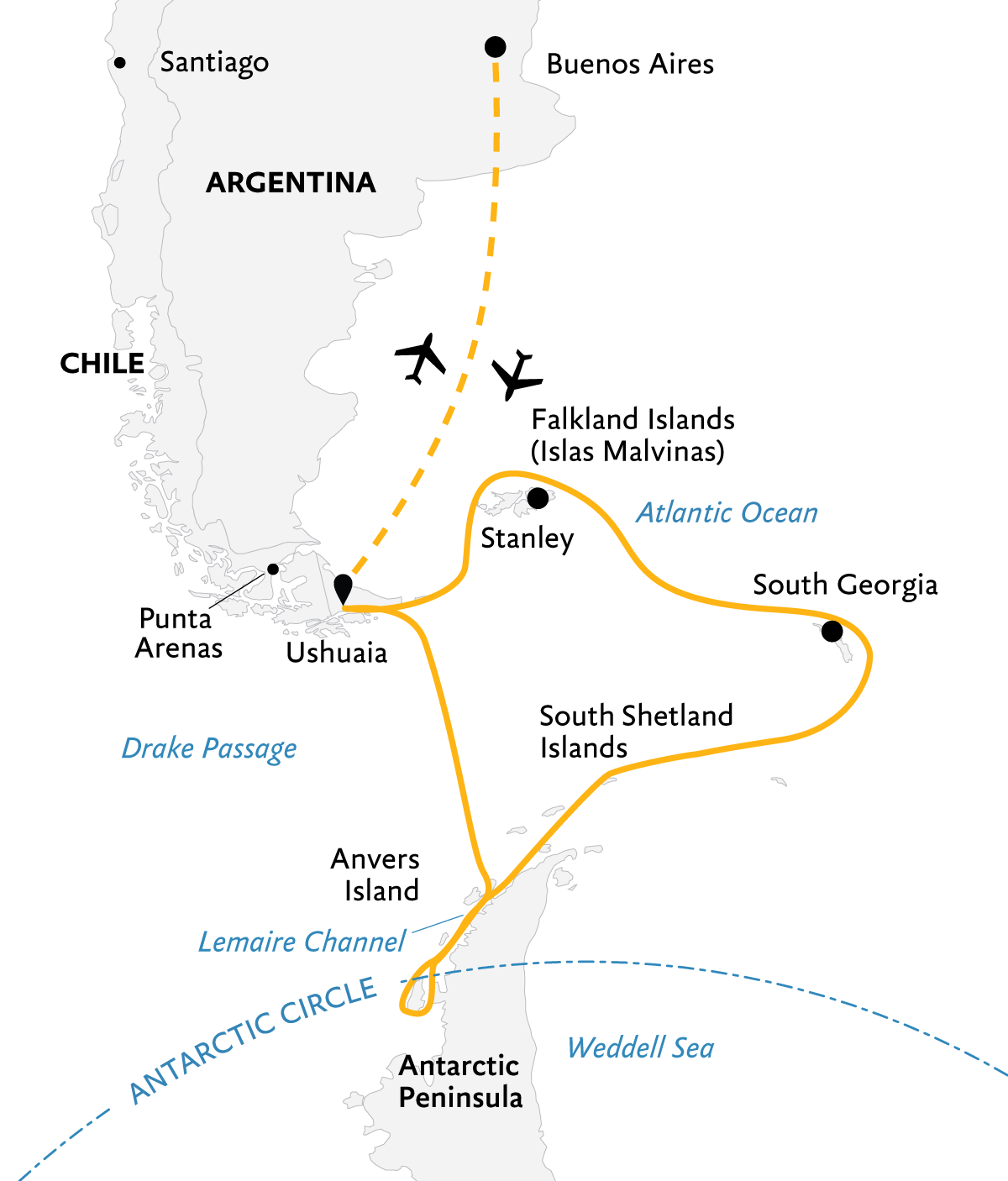 After more than three weeks of rare wildlife encounters and remarkable landscapes, your journey home begins. The unpredictable and exciting Drake Passage is an adventure unto itself. While being well taken care of by our expert onboard staff, you’ll have plenty of time to gaze out at the ocean, take pictures of seabirds swooping around the ship, and reflect on your remarkable Antarctic adventure.