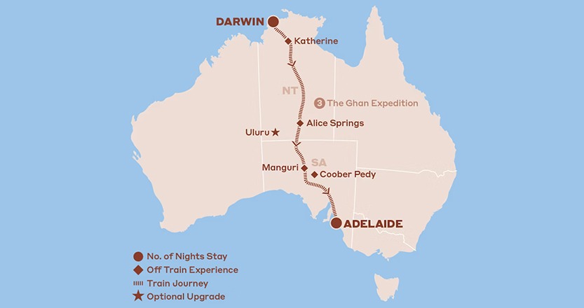 - 3-nights’ Gold Cabin on The Ghan train from Darwin to Adelaide