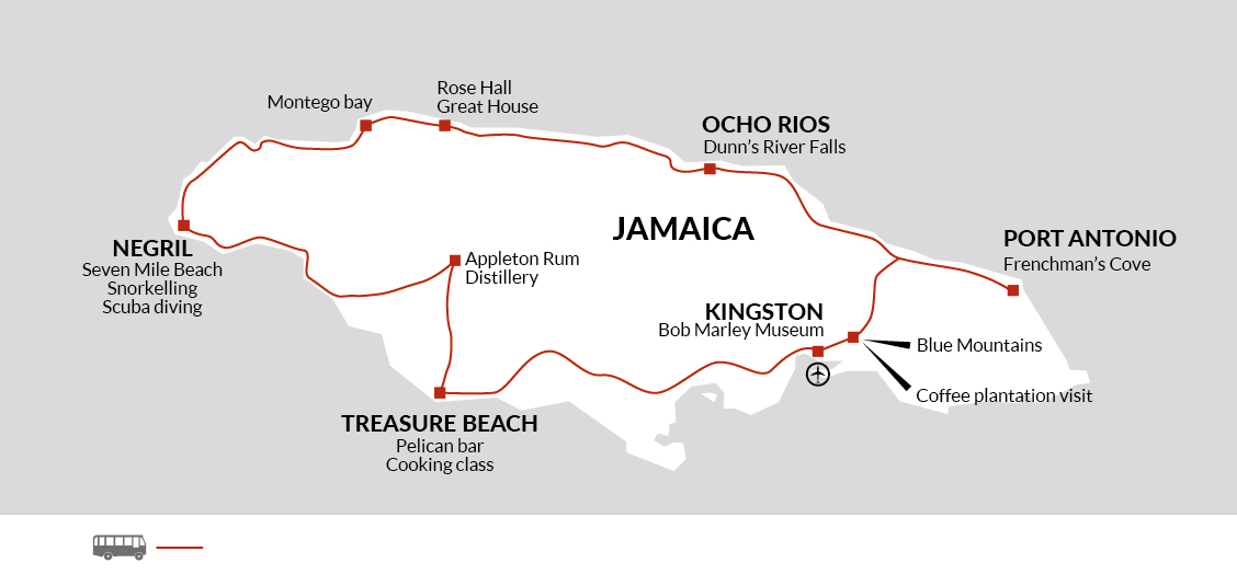 Discover the real Jamaica from white-sand beaches and local rum to the lush Blue Mountains|Swim in crystal clear waters and explore miles of white-sand beach|Feast on local food and rum and see Bob Marley's home