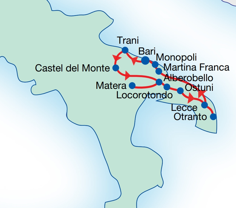Experience the beauty and heritage of Southern Italy on this 8-day Fantasia of Puglia tour. Begin in Bari with time to relax before exploring the city’s historic center, including the Basilica of San Nicola. Continue to Trani and the UNESCO-listed Castel del Monte, then on to Alberobello, famous for its distinctive Trulli houses. Visit the ancient cave dwellings of Matera, another UNESCO treasure, and stroll through the whitewashed towns of Locorotondo and Ostuni. Discover Lecce, the “Florence of the South,” and nearby Otranto, rich in Greek and Roman influences. Enjoy authentic Apulian cuisine, including a pasta-making experience at a local masseria, before visiting Martina Franca and Monopoli. With 4-star accommodations, an expert guide, and visits to Puglia’s most iconic sites, this small-group journey perfectly blends culture, history, and coastal charm.
