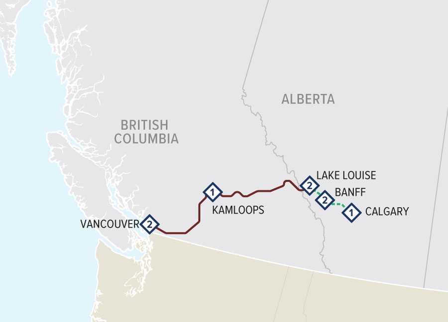 - 8 nights hotel: Vancouver, Kamloops, Lake Louise, Banff and Calgary