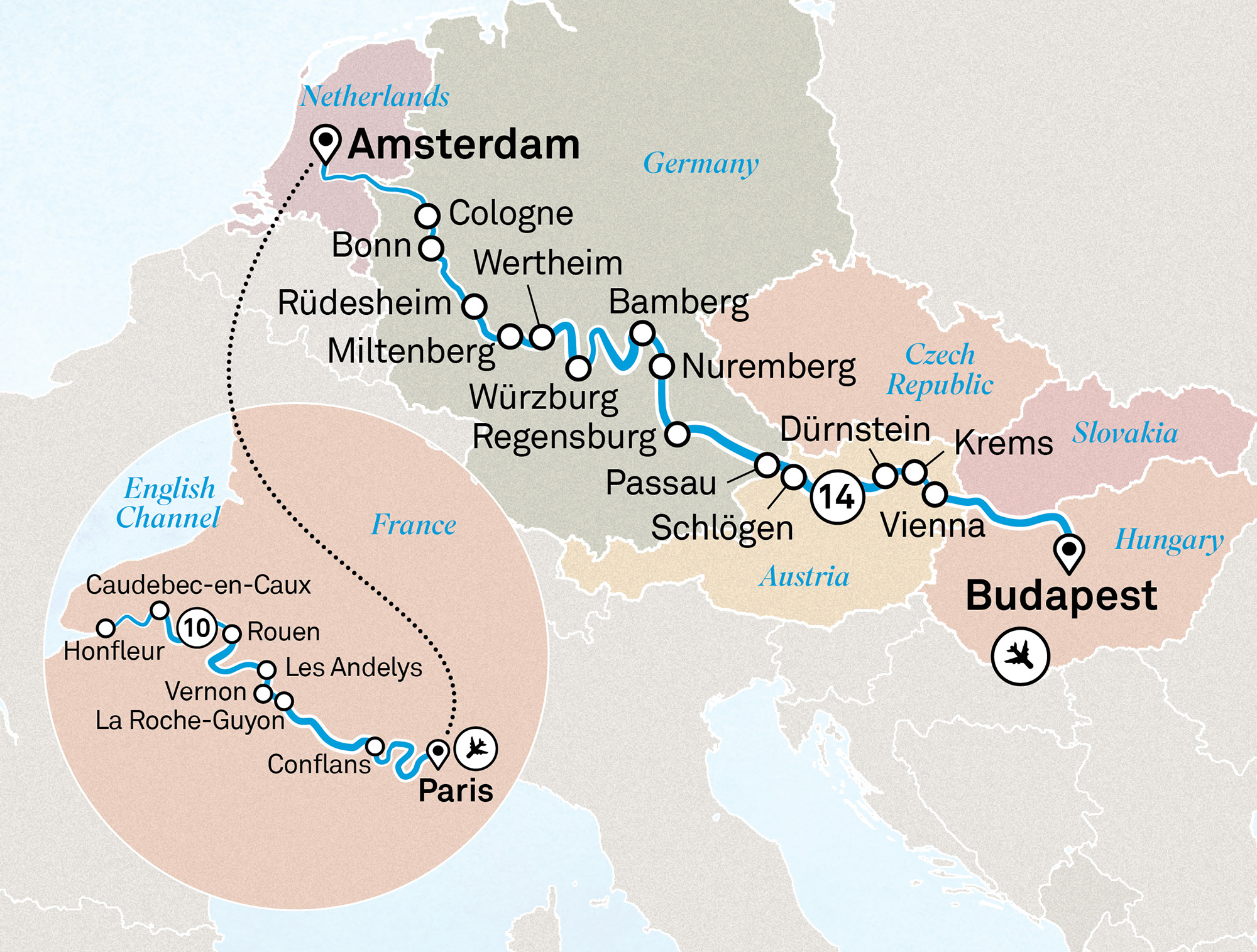 Today board an included flight from Paris to Amsterdam. On arrival you will board your luxurious Scenic Space-Ship where you will spend the next 14 nights cruising the Rhine, Main and Danube rivers to Budapest.